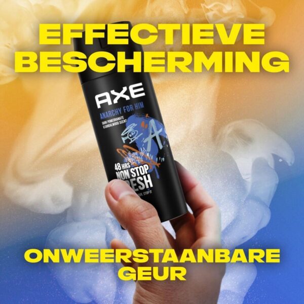 Verbeterde AXE Anarchy for Him Deodorant Bodyspray: voor effectieve bescherming en een onweerstaanbare geur. Breng fris blijven naar een hoger niveau. Leef dat dagelijkse frisse leven. Je weet nooit wat er kan gebeuren, dus heb je een deodorant bodyspray nodig die ervoor zorgt dat je de hele dag heerlijk ruikt, elke dag weer. Met zijn geurbeschermende technologie heeft de verbeterde AXE Anarchy for Him Deodorant Bodyspray het onder controle. De sensuele geur van granaatappel en sandelhout houdt je fris en 100% voorbereid. De hele dag door.