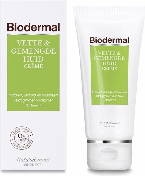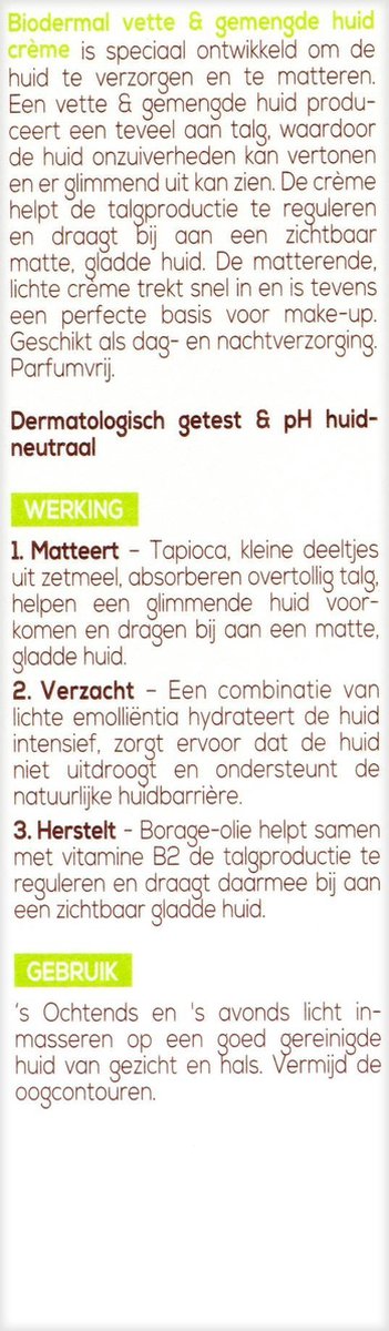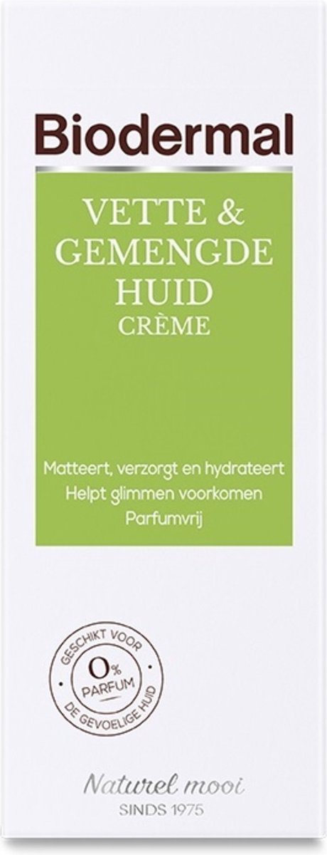 Biodermal Vette en Gemengde Huid crème helpt een glimmende huid te voorkomen en de talgproductie te reguleren. Een vette en gemengde huid maakt teveel talg aan waardoor je last kunt krijgen van puistjes, pukkels en mee-eters. Deze crème helpt de talgproductie te reguleren en draagt bij aan een een zichtbaar mattere en gladdere huid. Speciaal geschikt voor de volgende huidtypen: