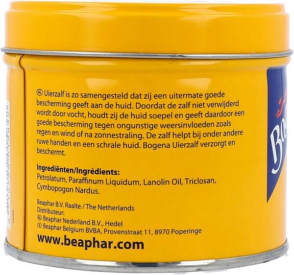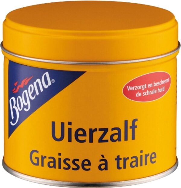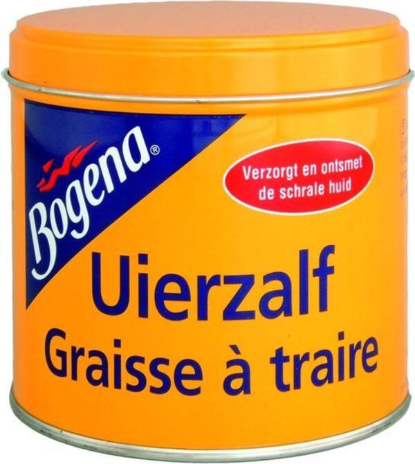 Uierzalf houdt de huid soepel en biedt een goede bescherming tegen weersinvloeden. Uierzalf is zo samengesteld dat zij een uitermate goede bescherming geeft aan de huid. Doordat de zalf niet verwijderd wordt door vocht, houdt zij de huid soepel en geeft daardoor tevens een goede bescherming tegen weersinvloeden zoals regen, wind of sterke zonnestraling. De zalf helpt bij o.a. ruwe handen en een schrale huid. Bogena Uierzalf verzorgt en ontsmet.