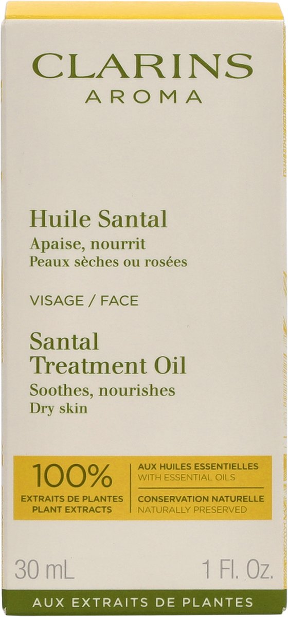 Clarins Santal Treatment Oil is een gezichtsverzorgingsolie die speciaal is ontwikkeld voor de droge en gevoelige huid. De formule bevat sandelhoutolie, die de huid kalmeert en verzacht, en cardamomolie, die de huid versterkt en beschermt. De olie kan worden gebruikt als een serum of als een extra hydraterende stap na de dagelijkse huidverzorgingsroutine.