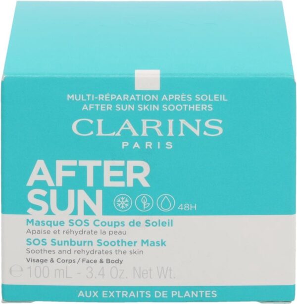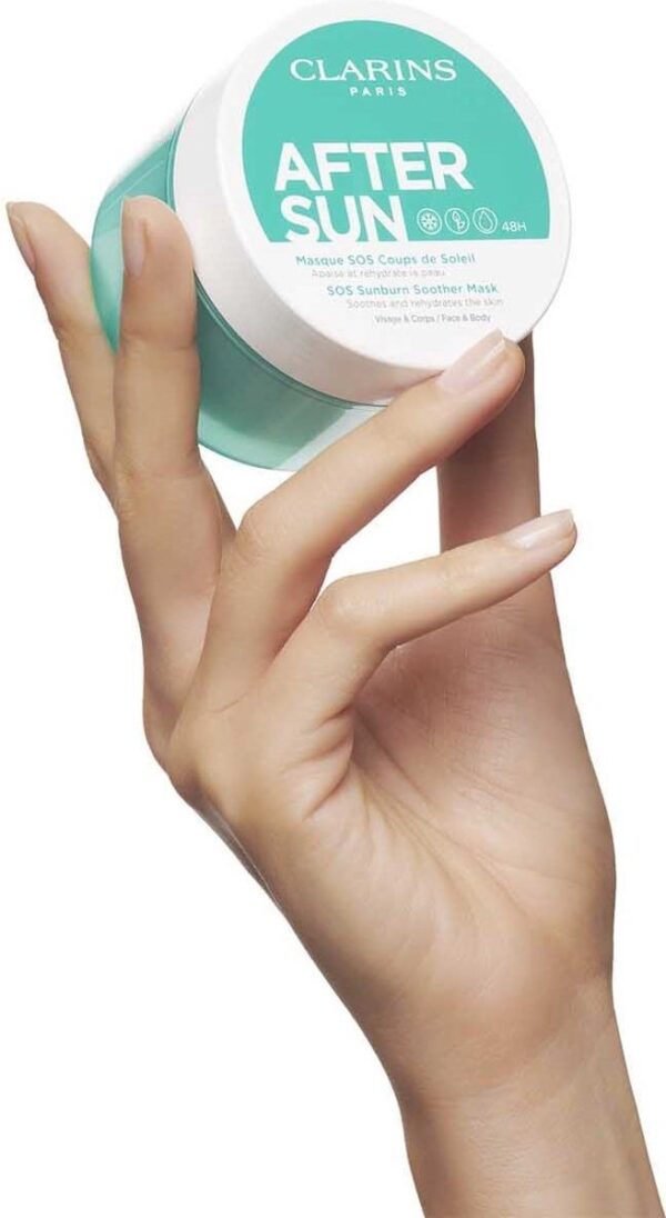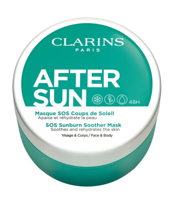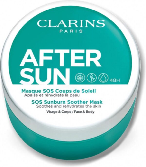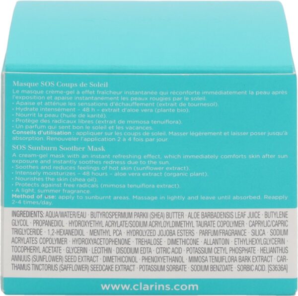 Het Clarins After-Sun-Pflege Masque SOS Coups de Soleil is een intensief after-sun-masker dat de huid na het zonnebaden direct verfrist en afkoelt en effectief voorziet in de inmiddels toegenomen behoefte aan verzorging en vocht. Een extract van zonnebloemen en mimosa tenuiflora beschermt en koelt de geirriteerde huid. Aloë; vera en shea-olie voorzien het van extra vocht en voedingsstoffen. Het positieve effect van het masker duurt 48 uur en beschermt tegen vrije radicalen.
