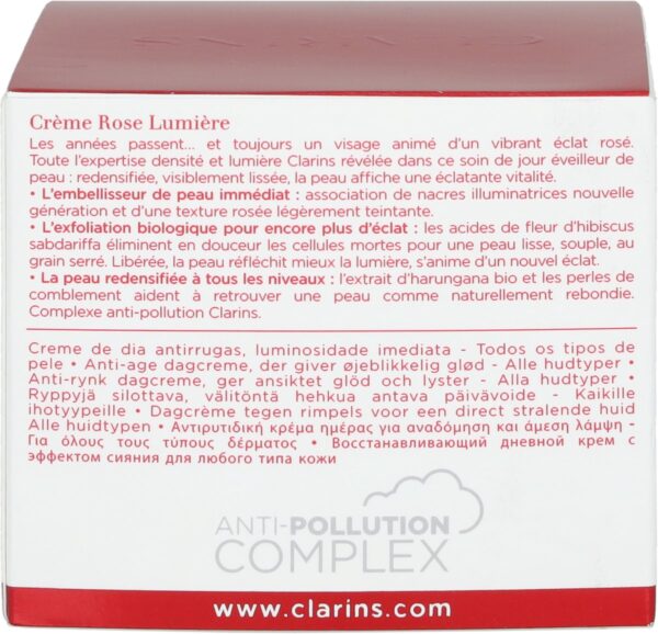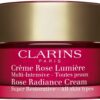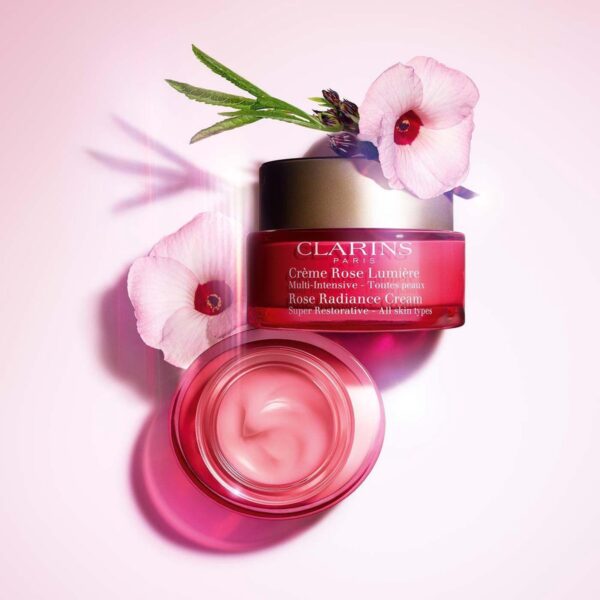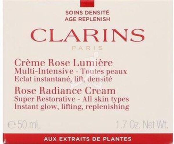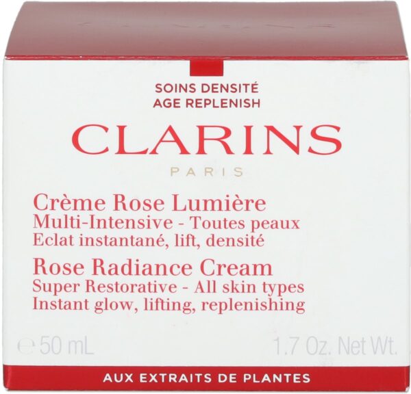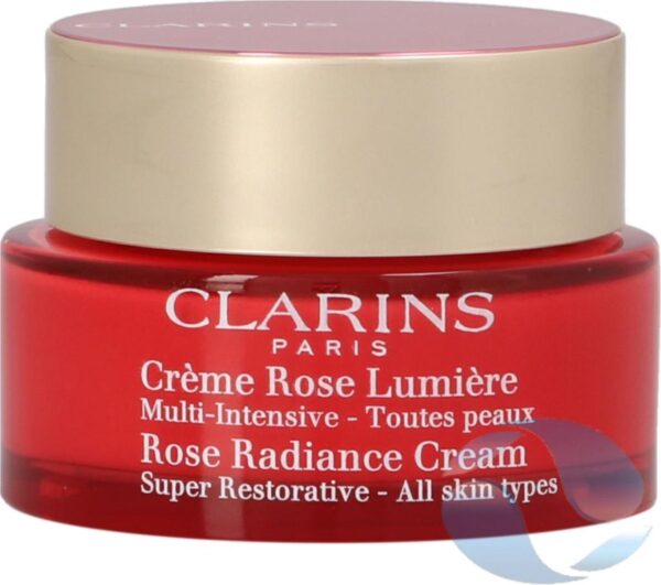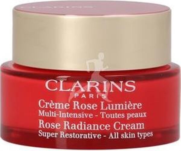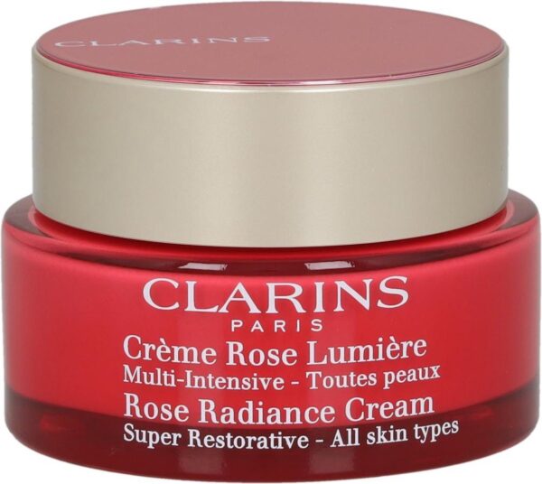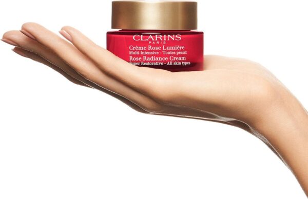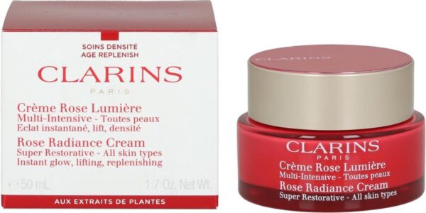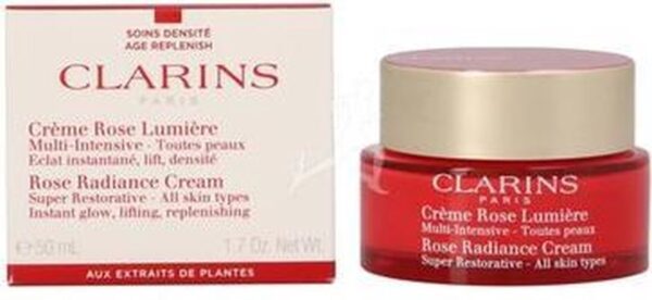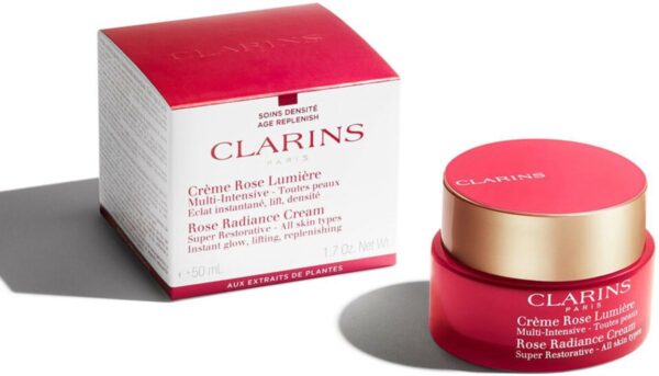 Rose Radiance Cream van Clarins is een hydraterende, liftende anti-aging dagcrème voor de rijpe huid. De crème bevat oplichtende parelmoerdeeltjes en heeft een licht exfoliërende werking voor een stralende, gladde huid. De roze kleur van de crème geeft de huid een frisse teint. Voor een stevigere huid die sprankelt.