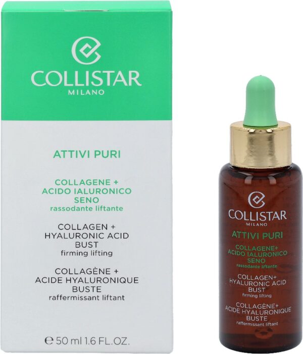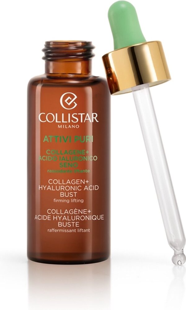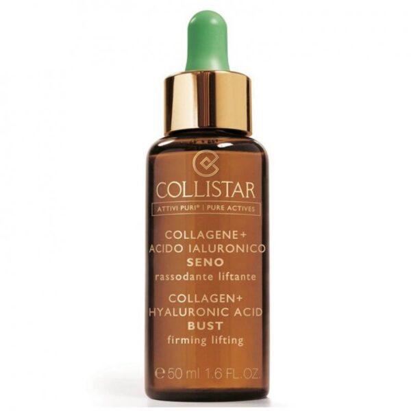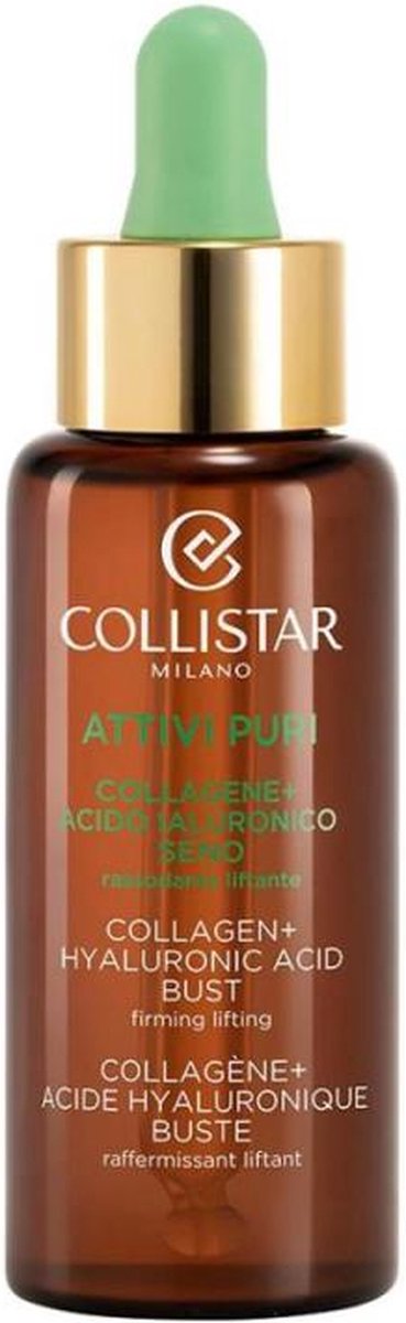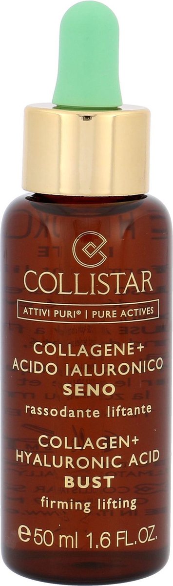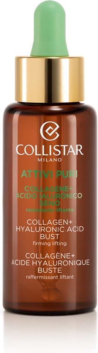 Slechts een aantal druppels per dag van de Bust Pure Actives van Collistar volstaan om het huidoppervlak te bedekken met een laagje dat de huid van de buste doelgericht en snel reconstrueert en lift. Collageen, de natuurlijke ondersteuning van de huid, helpt het huidweefsel van de borsten weer stevig en compacter te maken, het verlies aan veerkracht en elasticiteit van de huid te bestrijden en een verslapte huid en/of striae te voorkomen. Hyaluronzuur, hydrateert, helpt de huid van de borsten stevig en glad te houden doordat het een liftend effect kent, het verstevigt de verbinding tussen opper- en lederhuid en stimuleert het huidcelmetabolisme tot diep in de huid.