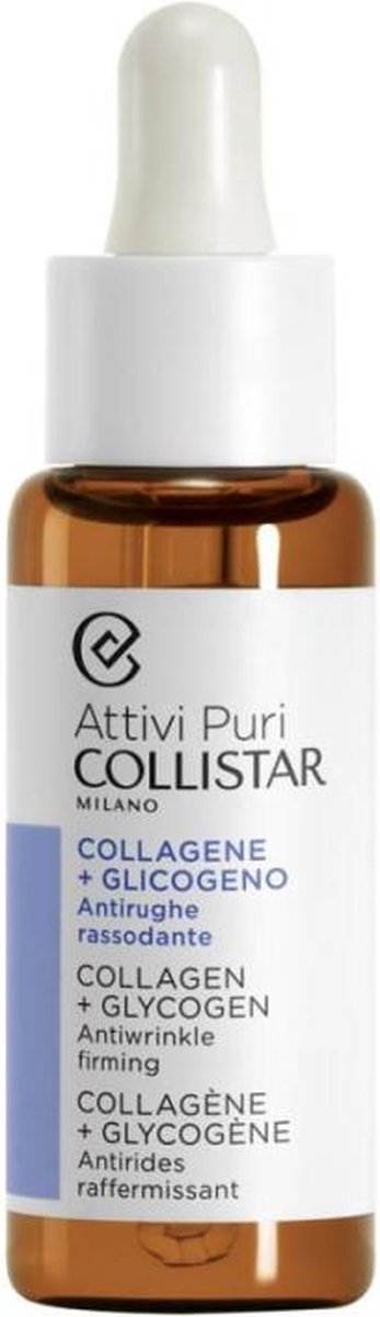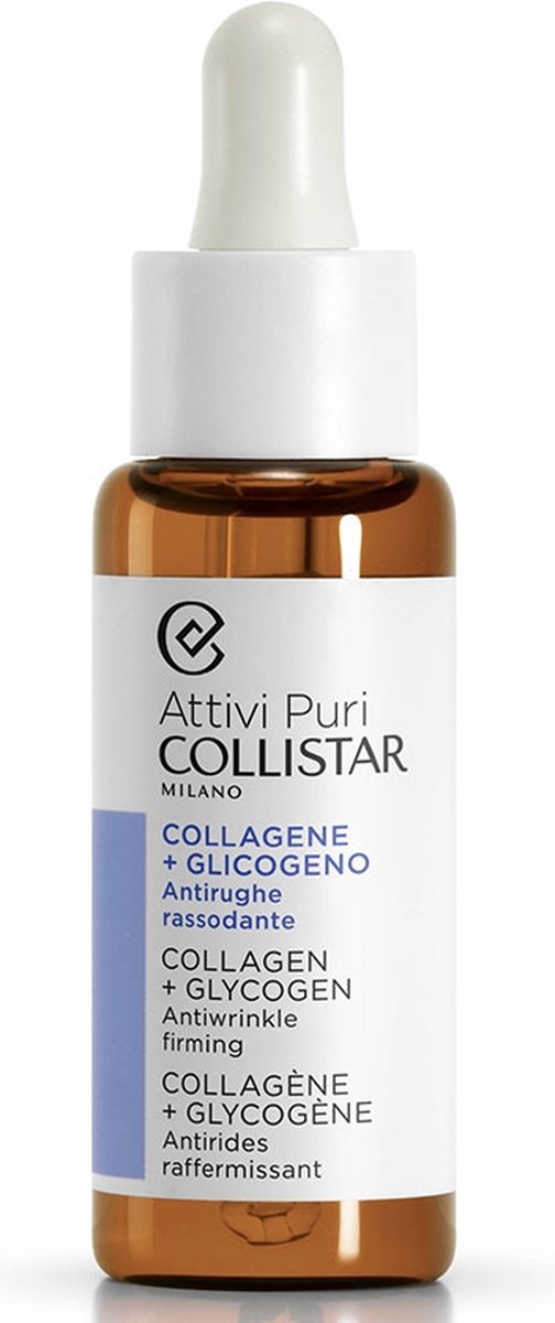 Collistar Attivi Puri Collagen + Glycogen is een verzorging in geconcentreerde druppels met aminozuren van plantaardig collageen om een intense verstevigende werking tegen huidveroudering en rimpels te creëren. Aan het plantaardige collageen is glycogeen toegevoegd: de energiebron die de productie van collageen versnelt. Al na enkele keren gebruik ziet de huid er steviger en zachter uit. Bij regelmatig en ononderbroken gebruik wordt de huid strakker, soepeler, sterker en beter beschermd. De rimpels en expressielijnen vervagen en de gezichtscontouren worden geleidelijk aan geherdefinieerd. Geschikt voor alle huidtypen, inclusief de gevoelige huid. Combineer de verzorging in druppels met de crème voor een optimaal resultaat.-Collistar Attivi Puri Collagen + Glycogen Gezichtsserum 30 ml