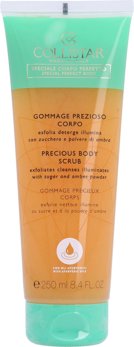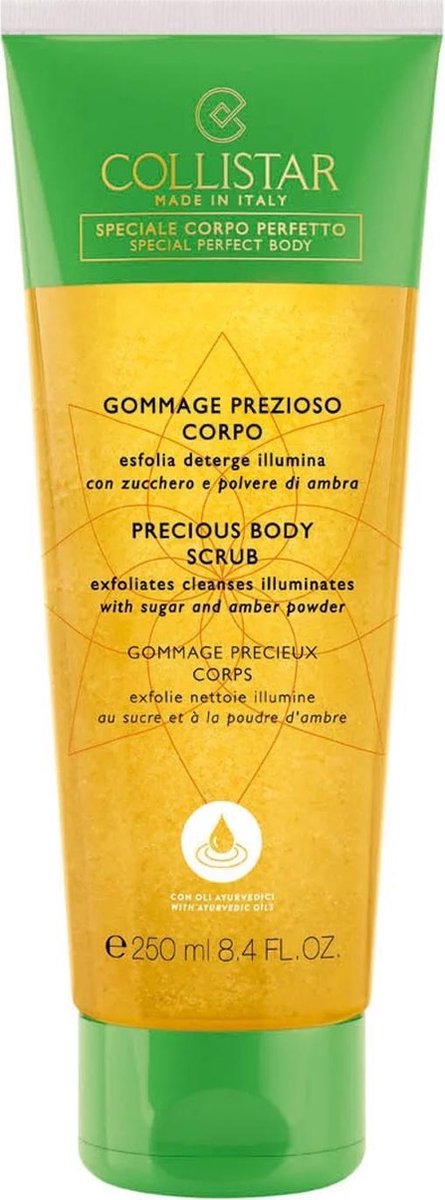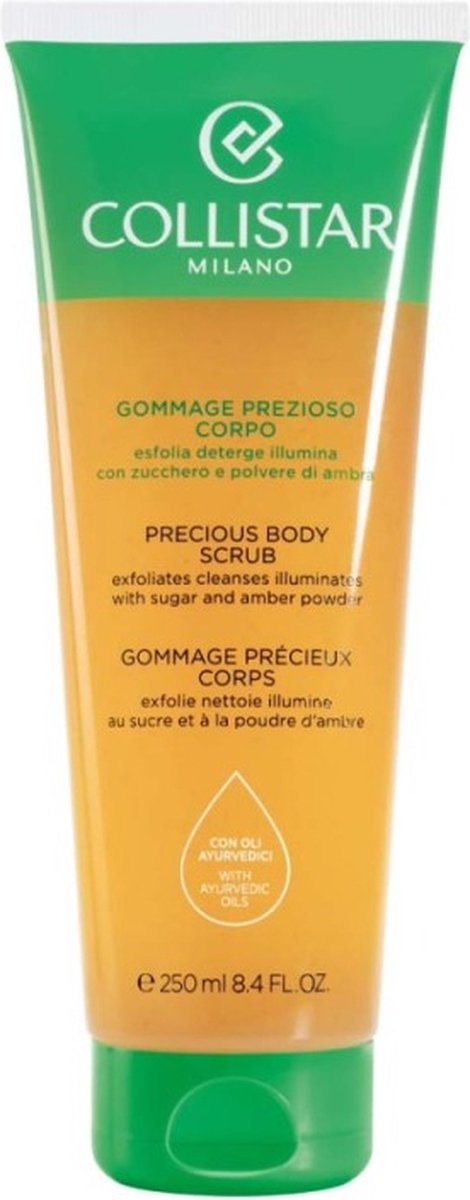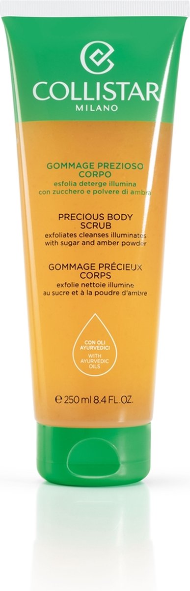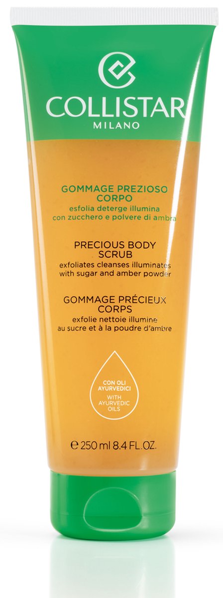 De Precious Body Scrub van Collistar is een milde en reinigende peeling. De scrub van Collistar verzacht, voedt en revitaliseert de huid dankzij kostbare oliën gebaseerd op de ayurvedische traditie (sesam-, neem- en damastroosolie). Suiker en amberpoeder exfoliëren de huid, terwijl papaja de huid doet stralen. De betoverende geur zorgt voor een heerlijk gevoel van welzijn.