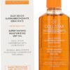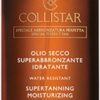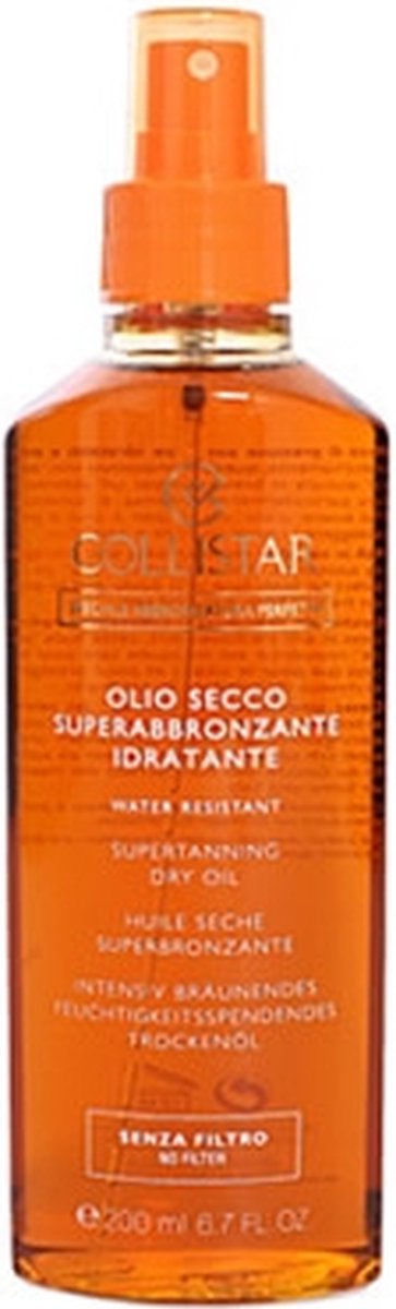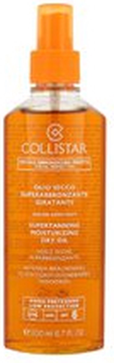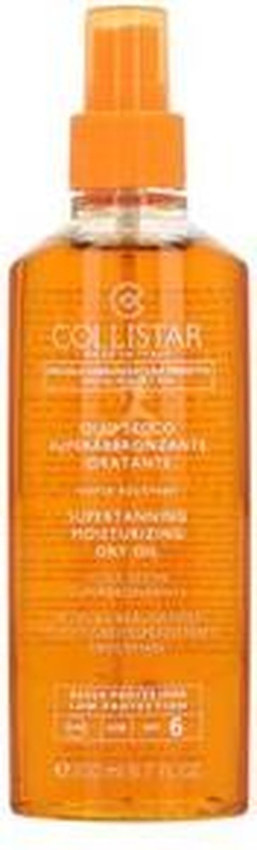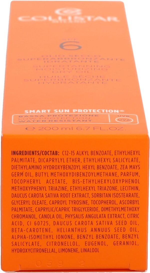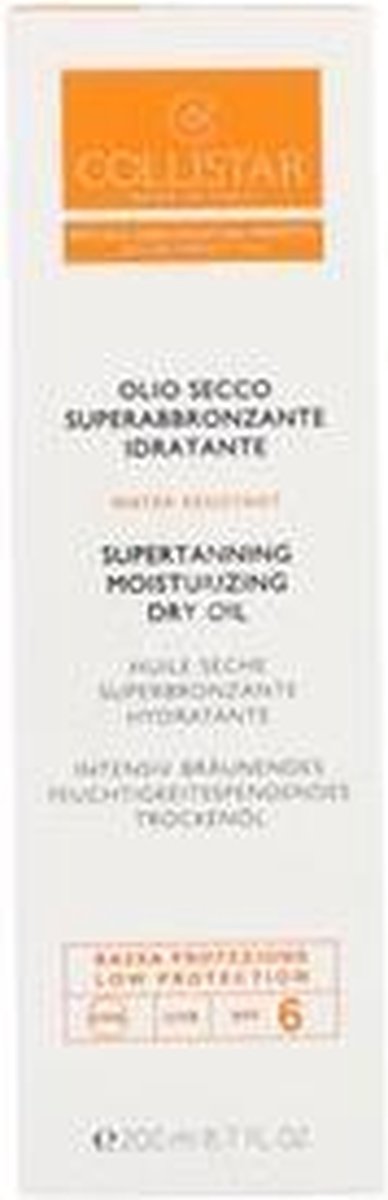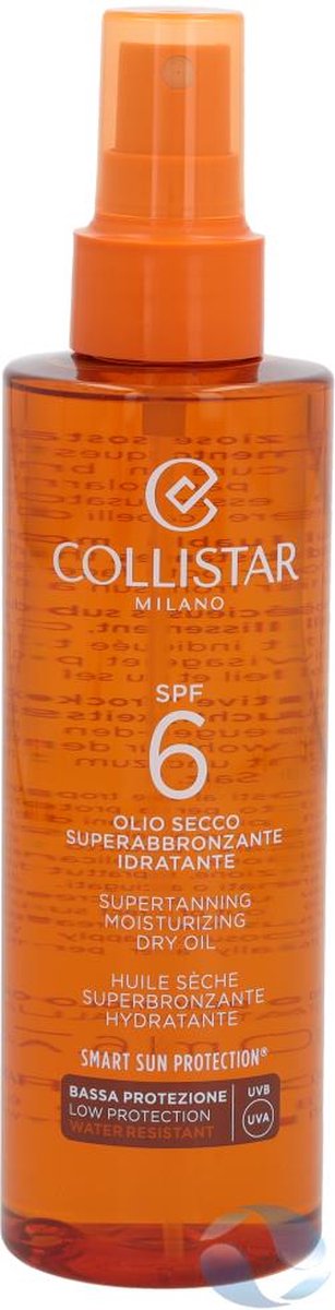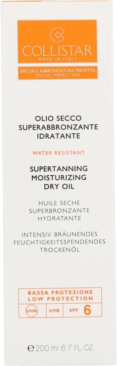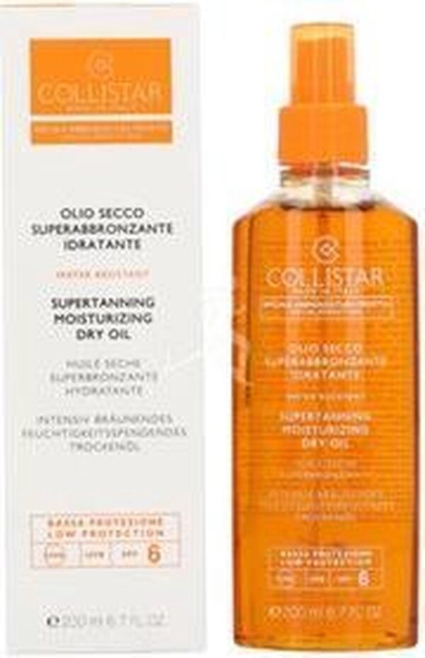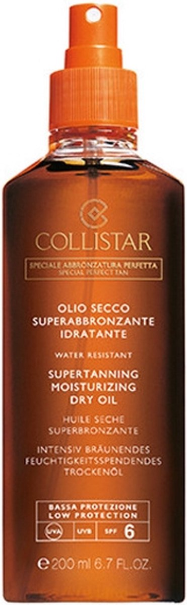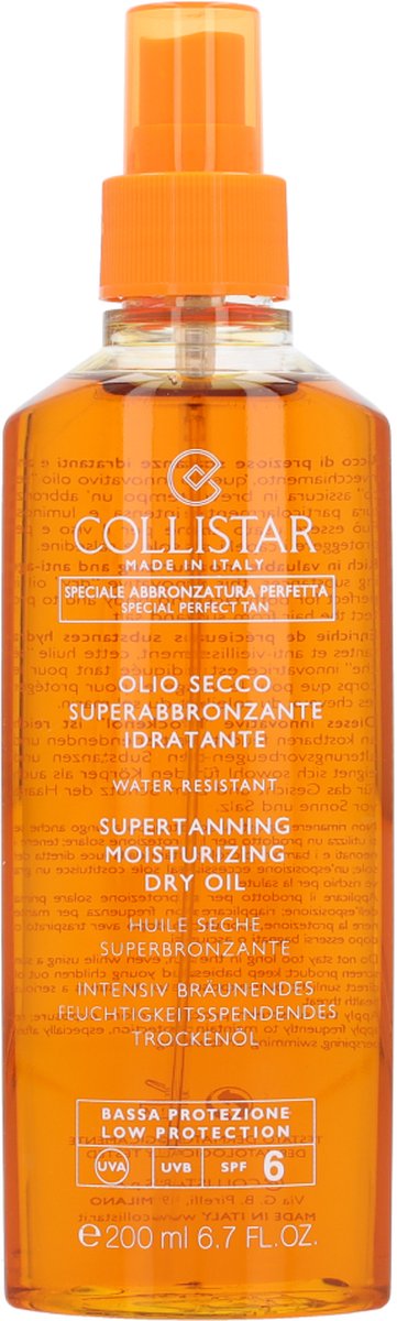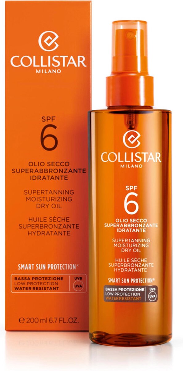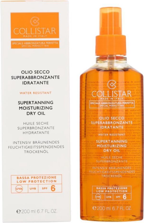De Supertanning Dry Oil van Collistar is een zonnebrandolie met SPF 6 die geschikt is voor het gezicht, het lichaam en de haren. De dry olie zorgt voor een snelle bruining van de huid zonder dat deze de huid vettig of plakkerig laat aanvoelen en trekt snel in. De olie is verrijkt met vitamine E, calendulaolie, hazelnootolie, wortelolie en walnootdopolie die een waterresistent laagje op de huid achterlaten.
