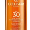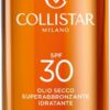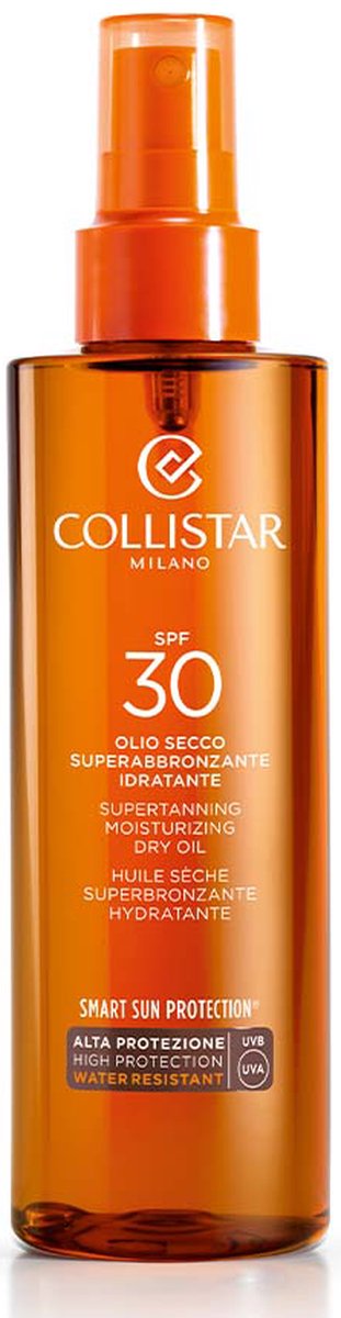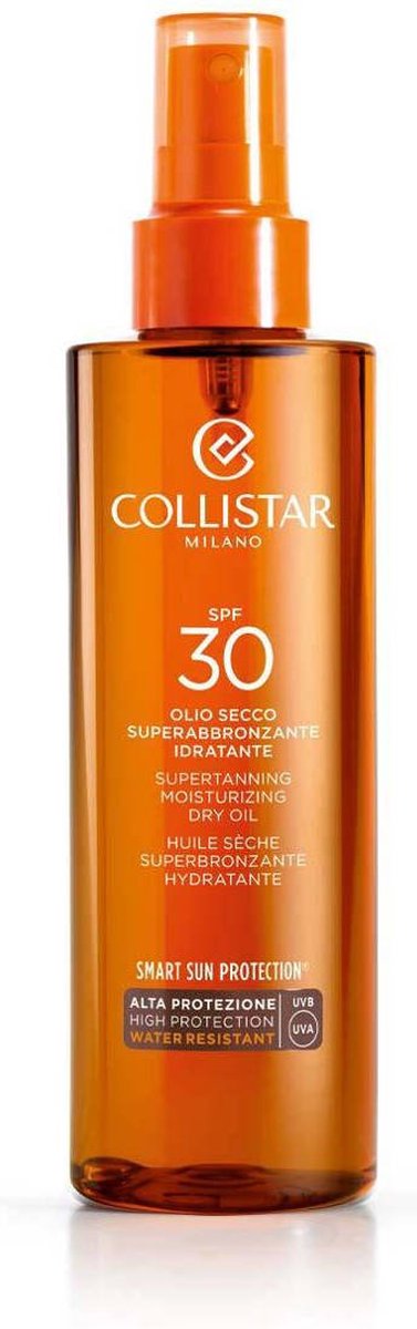 Ideaal voor iedereen die een intens gebruinde teint en tegelijk een optimale bescherming wenst. Deze innovatieve ‘droge’ olie bevat een complex van wortelolie en een melanineprecursor met een verhoogd bruiningsvermogen, vitamine E en kostbare vochtinbrengende en versoepelende bestanddelen die huidveroudering voorkomen. Doordat de olie waterbestendig is houdt ze de huid zacht en glad, ook na lange blootstelling aan de zon. De ‘droge’ textuur zorgt ervoor dat het product snel wordt opgenomen en niet vet is. Kan ook op het gezicht worden gebruikt.-Collistar Sun Care Supertanning Moisturizing Dry Oil Spf 30 Zonneolie 200 ml