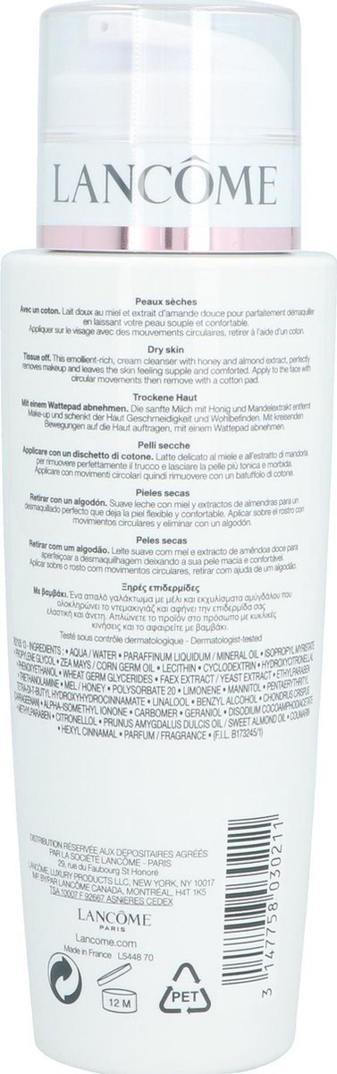 Lancôme Galatée Confort is een voedende, verzorgende reinigingsmelk geschikt voor de droge huid. Een rijke lotion die zeer aangenaam aanvoelt op de huid. Voedende melkproteïnen en actief hydraterende en verzachtende ingrediënten voeden de droge huid tot diep in elke cel. De milde formule van deze zachte reinigingsmelk kalmeert, herstelt en ontspant de huid. Een fluweelzachte huid is het resultaat. Geschikt voor de droge en normale huid.