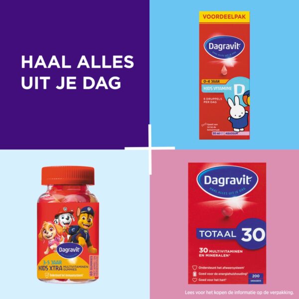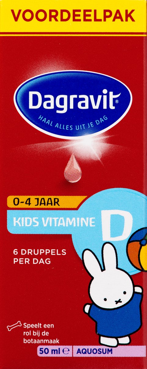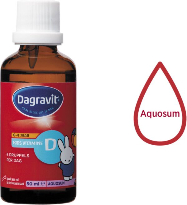 Haal alles uit je dag met Dagravit Kids Vitamine D Aquosum! Opgroeiende baby’s en jonge kinderen tot 4 jaar hebben voor de normale groei en ontwikkeling van het beendergestel voldoende vitamine D nodig. De Gezondheidsraad adviseert dan ook dat kinderen van 0 tot 4 jaar een aanvulling van 10 microgram vitamine D per dag gebruiken. De vitamine D druppels van Dagravit helpen tegemoet te komen aan deze specifieke behoefte van kinderen tot 4 jaar. Handig in druppelvorm, waardoor het makkelijk is toe te dienen aan vloeibare of vaste voeding!