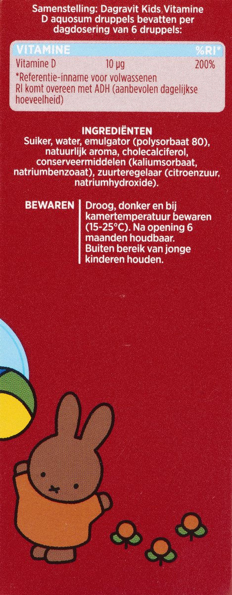 Dagravit Kids Vitamine D Aquosum is een voedingssupplement. De aanbevolen dagelijkse dosering niet overschrijden.