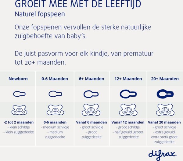 Difrax fopspenen zijn verkrijgbaar in 5 maten: Newborn, 0-6 maanden, 6+ maanden, 12+ maanden en 20+ maanden. De zuiggedeeltes en schildjes van onze fopspenen worden steeds een maatje groter en veranderen mee met de leeftijd van je kindje. Onze Newborn speentjes zijn ook te gebruiken voor premature baby’tjes.