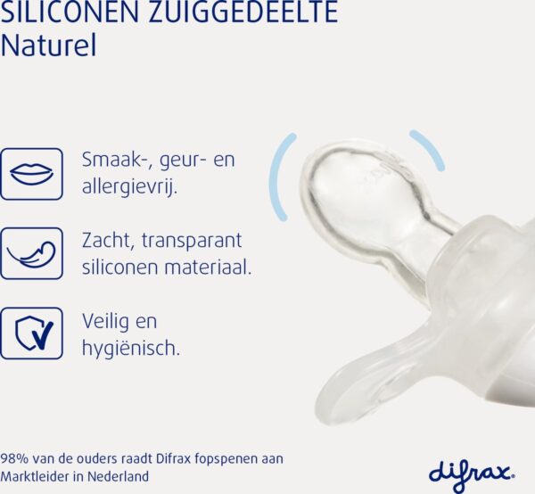 • Difrax fopspenen hebben een siliconen zuiggedeelte wat hygiënischer en veiliger is dan natuurrubber.