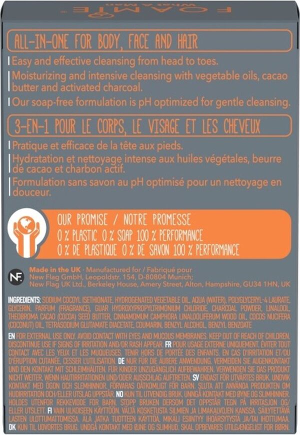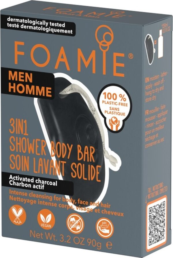 De 3-in-1 What a Man Shower Body Bar van Foamie is de ideale bar voor onder de douche. De bar is namelijk een lichaamsreiniger, gezichtsreiniger en shampoo in 1! De bar is ideaal voor dagelijk gebruik, en gaat langer mee dan een douchegel uit een plastic fles. De Foamie What a Man Shower Body Bar verzorgt, reinigt en geeft je huid en haar een heerlijk gevoel.