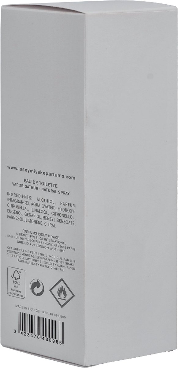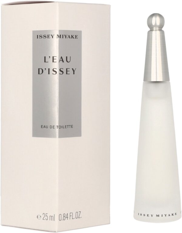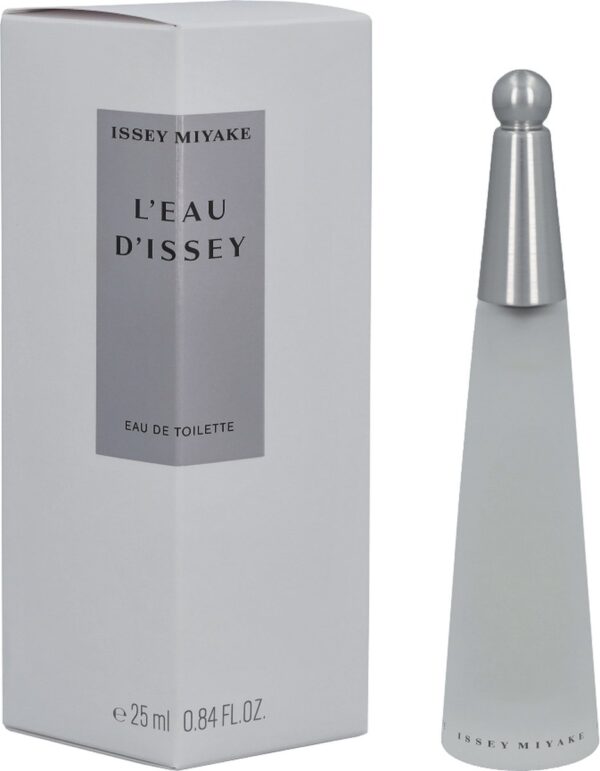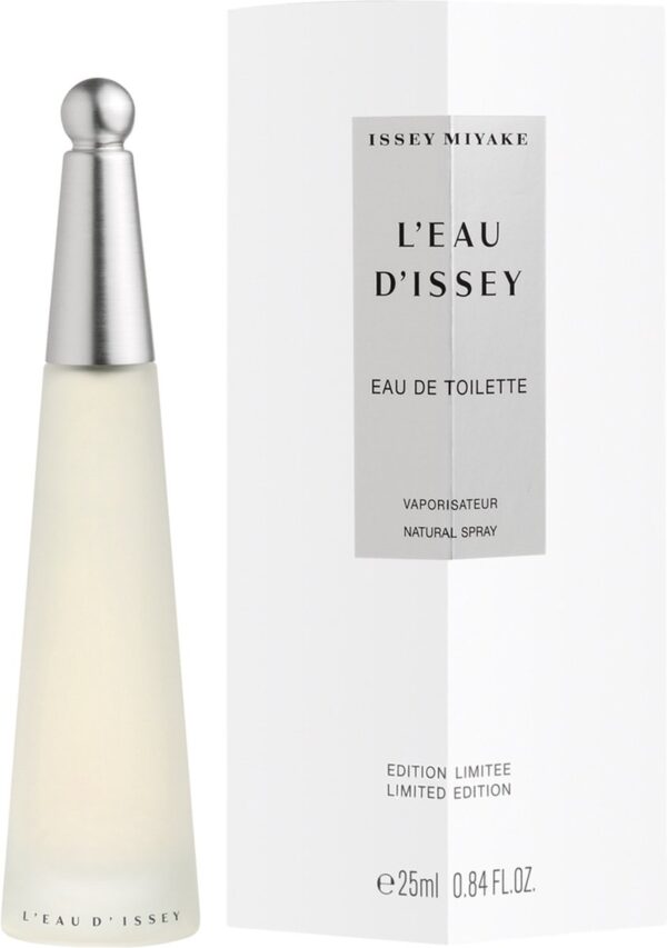 L’Eau d’Issey Eau de Toilette van Issey Miyake. Oorspronkelijk, water, bron van leven, origineel element, grondstof, oneindige mogelijkheden. Een waterdruppel heeft het eerste parfum van Issey Miyake opgeleverd. Een druppel om de elementen te ontmoeten, een eau de toilette waarvan de vorm wordt verteld door de fles. Een parfum waarvan de geur doet denken aan een druppel water op de huid van een vrouw. Een dames parfum in een oogverblindende en slanke fles, waarvan de dop van geborsteld metaal subtiel bedekt is met een transparante bal, als een druppel water.