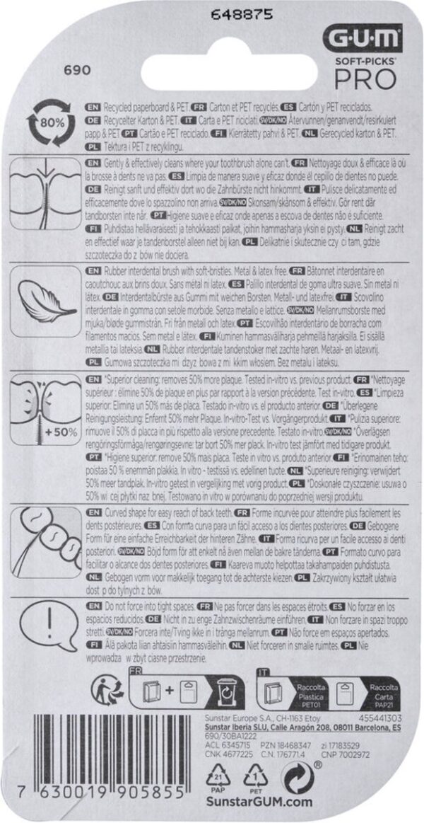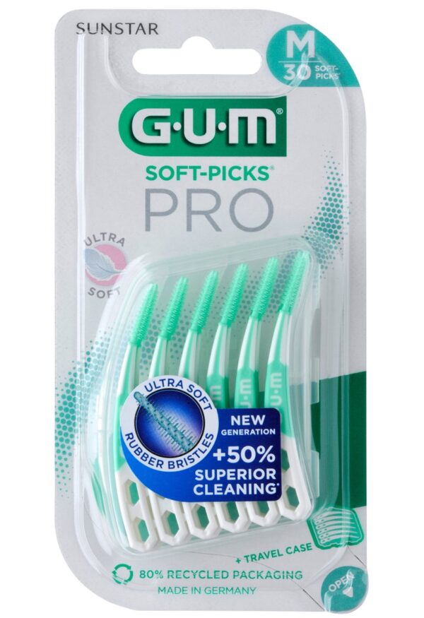 Met onze populaire rubberen interdentale microborstels kun je zacht en effectief reinigen daar waar je tandenborstel alleen er niet bij kan. GUM® SOFT-PICKS® PRO helpt bij het verwijderen van voedselresten en tandplak die tussen je tanden zijn verborgen dankzij zachte, flexibele rubberen borstelharen die comfortabel tussen de tanden glijden voor een zachte, maar diepe reiniging. Deze microborstel biedt ook superieur tandvlees- en tandcomfort – het is ontworpen zonder latex, hout of metaal – en masseert zelfs je tandvlees.