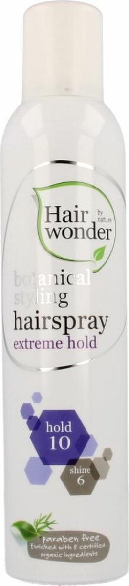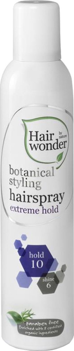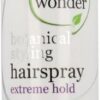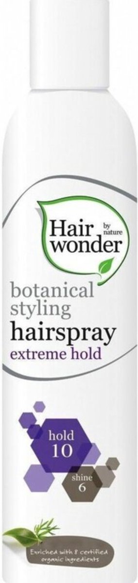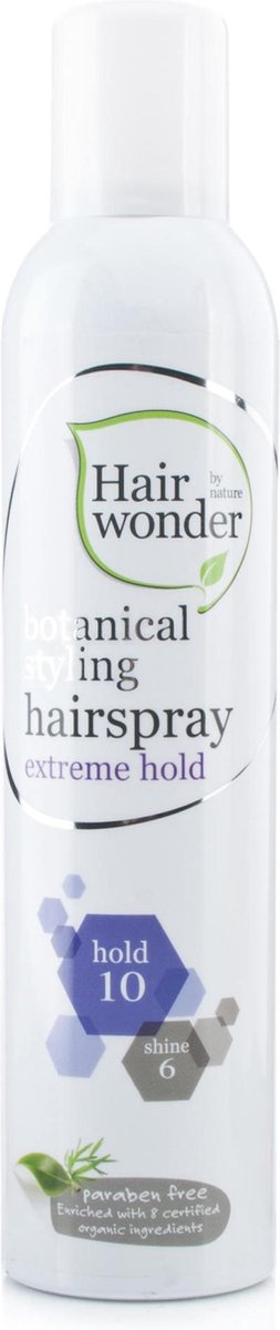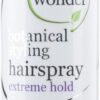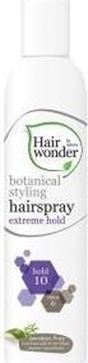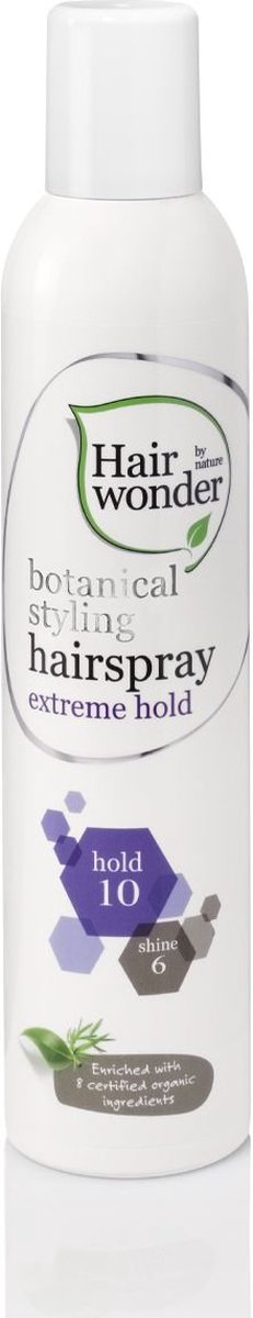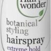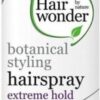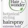 Hairwonder Botanical Hairspray Extreme Hold is een natuurlijke haarspray die je haar extreem fixeert, de hele dag. De spray verzorgt je haar met acht gecertificeerde biologische ingrediënten en de gewichtsloze formule is gemakkelijk uitkambaar. brand HAIRWONDER