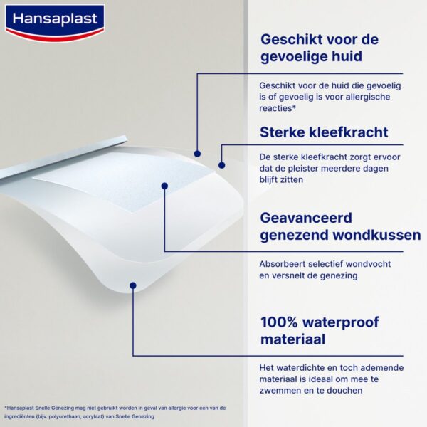 Hansaplast Fast Healing pleisters maakt een tot 2 keer snellere wondgenezing mogelijk vergeleken met droge wondgenezing en zijn geschikt voor het afdekken van alle soorten kleine wondjes. Voor een optimale genezing zou de pleister meerdere dagen gedragen moeten worden.