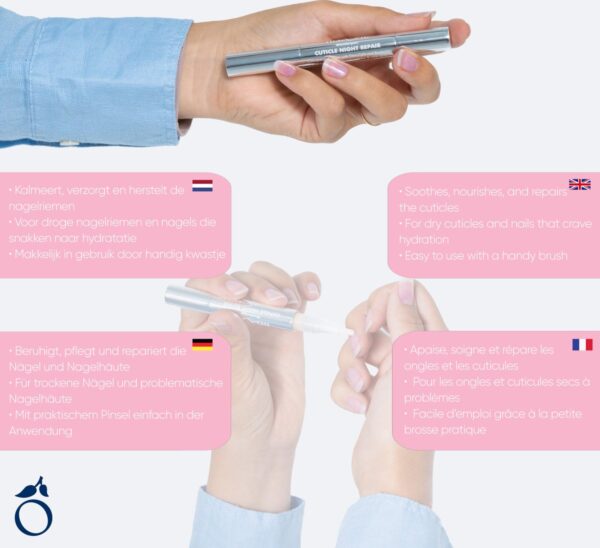 Verwen je nagelriemen met ons herstellende serum door aan het uiteinde van de Wonderpen mini te draaien zodat er een druppel vrijkomt. Breng het serum eenvoudig aan op de nagels en nagelriemen met het kwastje en masseer lichtjes in. Gebruik het nagelriemserum gedurende een week, voordat je gaat slapen, voor het beste resultaat.