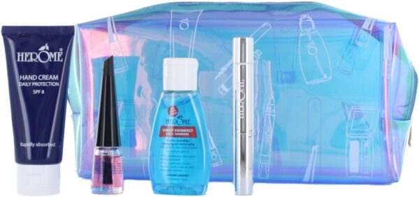Bestel nu voor gezonde en verzorgde handen, waar en wanneer dan ook! Bescherm je huid tegen uitdroging en geniet van stralende handen deze zomer. Perfect voor gebruik thuis, onderweg en op vakantie. Haal het meeste uit je zomerse avonturen met Herome’s limited edition Holiday Manicure Set. Deze set bevat alle essentiële hand- en nagelverzorgingsproducten in mini-reisformaten, zodat je jouw handen er fantastisch uit kunt laten zien, waar je ook gaat.