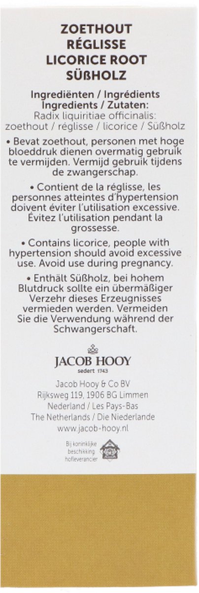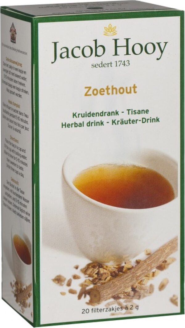 Extra informatie LATIJNSENAAM Nee GEBRUIK Gebruiksaanwijzing: Doe het zakje in een kopje en overgiet dit met kokend water, 5-10 minuten laten trekken. Driemaal daags een kopje drinken. Mag gezoet worden. NOOT Nee WAARSCHUWING Bevat zoethout, mensen met een hoge bloeddruk dienen overmatig gebruik te vermijden. SAMENSTELLING Ingrediënten: Radix liquiritiae officinalis (Zoethout) INHOUD 20zkj VERPAKKINGSEENHEID 12