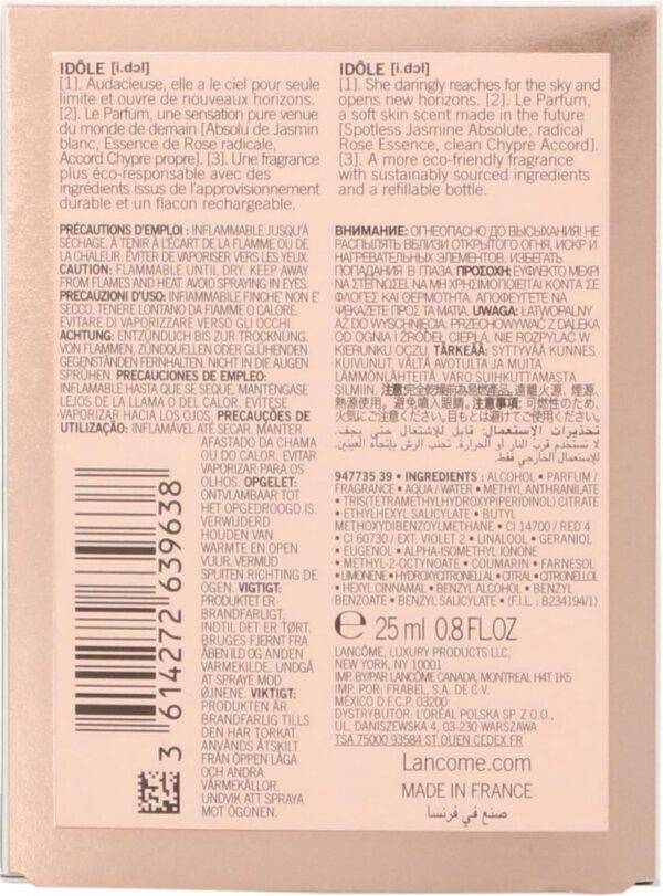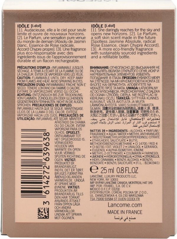 De fles, slank en elegant, is een eerbetoon aan de moderne vrouw. Met zijn slanke design en gouden accenten, straalt Lancôme Idôle pure luxe uit.