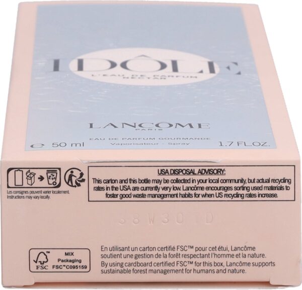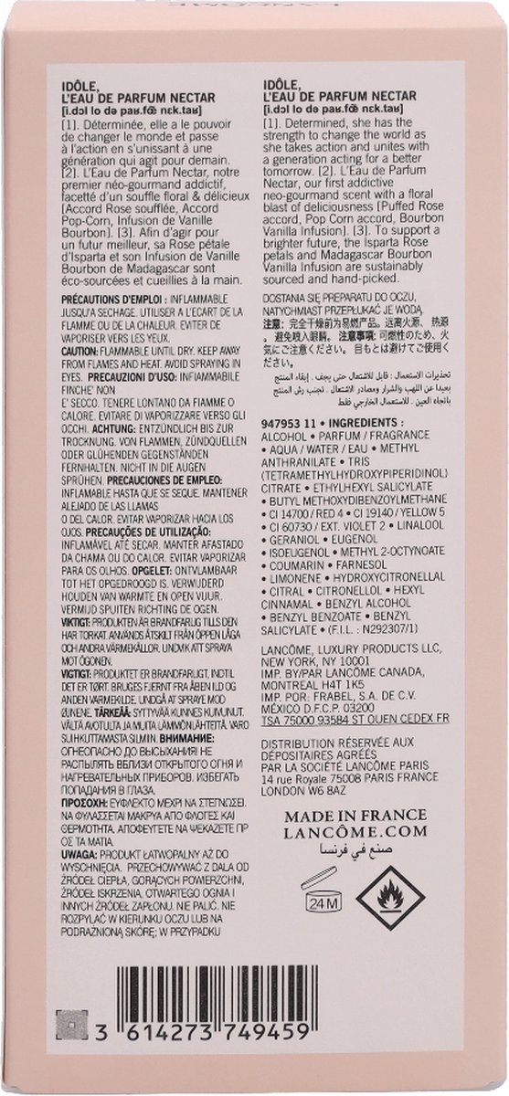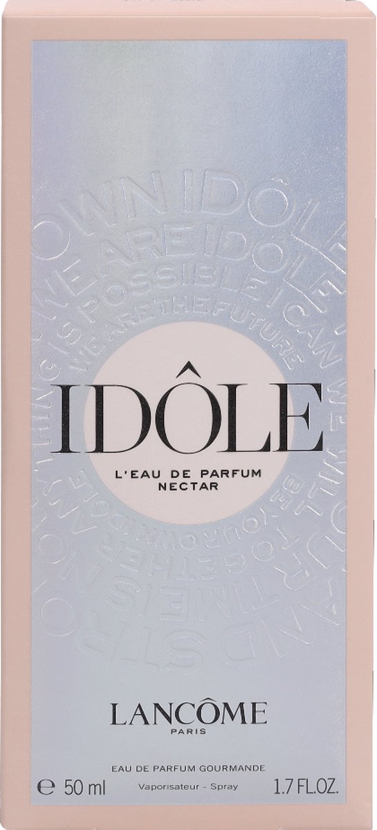 De dunne flacon is perfect voor onderweg De dunste flacon ter wereld, slechts 1,5 cm dik. Met een vurige perzikkleurige toon; een waar voorwerp van verlangen. Lancôme Idôle l’Eau de Parfum Nectar weerspiegelt de vastberadenheid van vrouwen die samen op weg gaan naar een betere toekomst. En omdat niet handelen voor morgen geen optie is, is de flacon gemaakt van gerecycled glas.