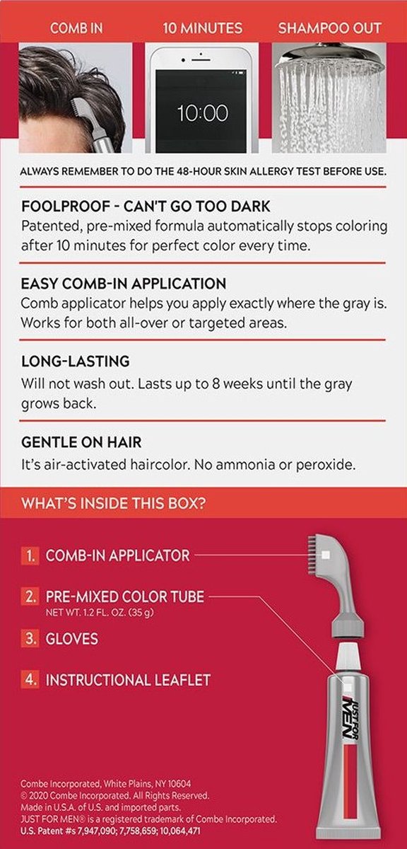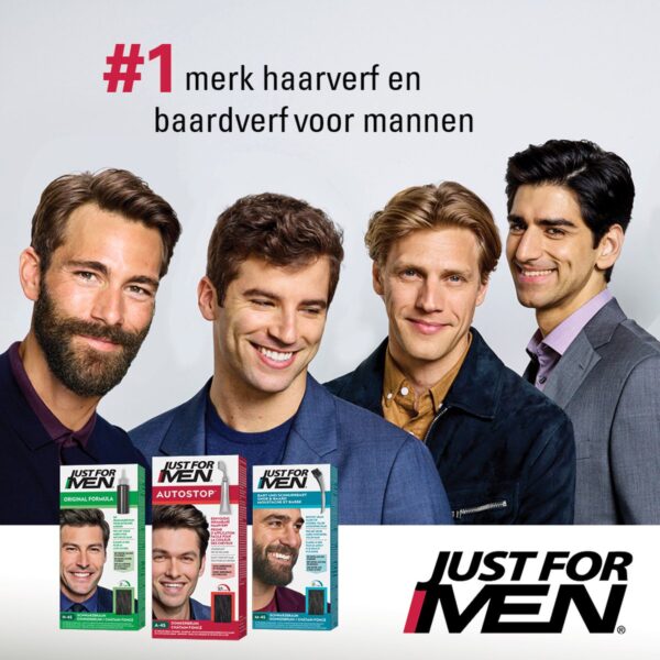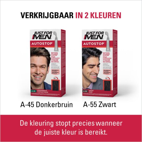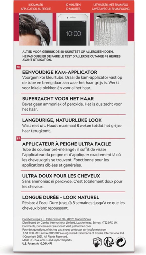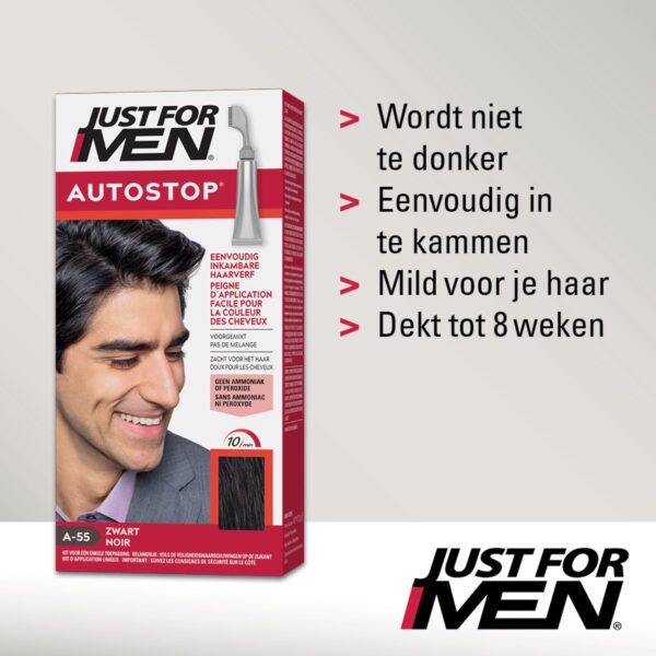 Just for Men Autostop Haarkleuring A55 Zwart is een haarkleuring speciaal voor mannen die grijze haren eenvoudig laat verdwijnen. De innovatieve door de lucht geactiveerde formule zorgt ervoor dat de subtiele kleurvariaties van het haar behouden blijven. Het stopt precies wanneer de juiste kleur is bereikt, voor het perfecte resultaat. Elke keer weer. Het is gemakkelijk in gebruik, zonder mengen en rommel. Gewoon inkammen en uitwassen met shampoo en het duurt slechts 10 minuten.