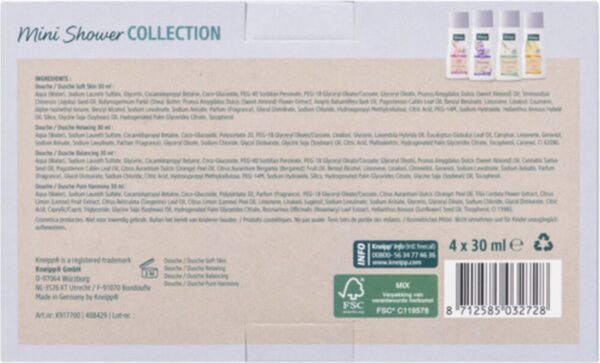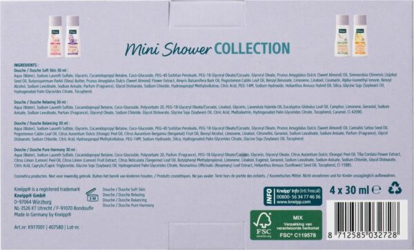 Geniet van een unieke douche-ervaring met de Kneipp® geschenkset douche mini, bestaande uit 4 mini douches in verschillende geuren. De natuurlijke formuleringen, met voedende plantaardige en verkwikkende etherische oliën, beschermen tegen uitdroging en maken je huid zacht en soepel.
