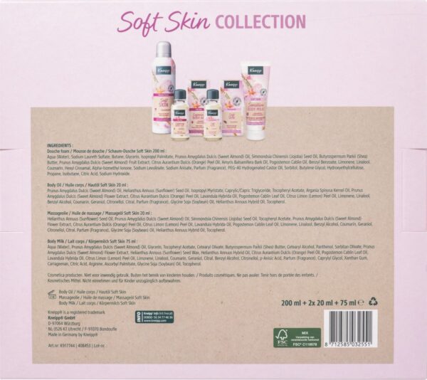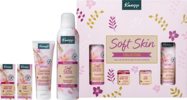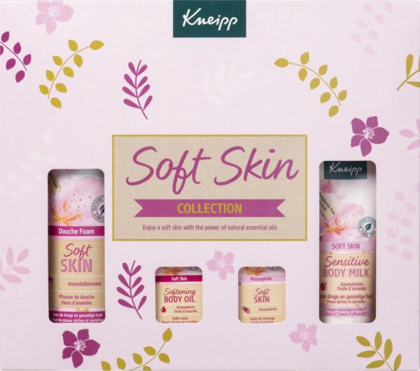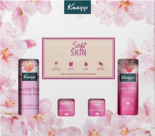 Geniet van de natuurlijke Kneipp® Soft Skin – Amandelbloesem producten voor een fluweelzachte huid. Deze geschenkset bevat een Soft Skin douche foam 200ml, Soft Skin body lotion 75ml, Soft Skin huidolie 20ml en een Soft Skin massageolie 20ml.