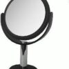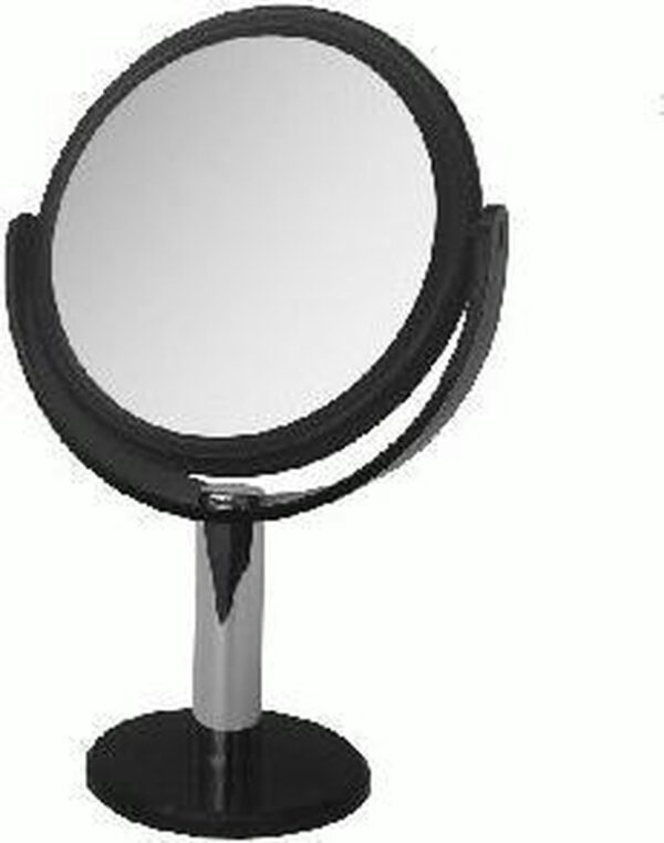 Dubbelzijdige make-up spiegel met zwarte kunststof afwerking. De spiegel is draaibaar en heeft een normale kant en één die tien keer vergroot. Make-up aanbrengen, epileren of scheren wordt met deze make-up spiegel nog eenvoudiger. De spiegel heeft een ronde voet en de hoogte van de spiegel is 29 cm. De diameter is 17,2 cm en de doorsnede van het spiegelvlak is 15 cm,