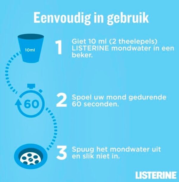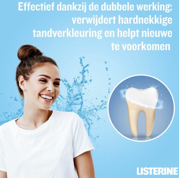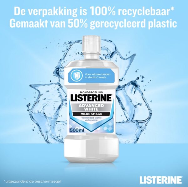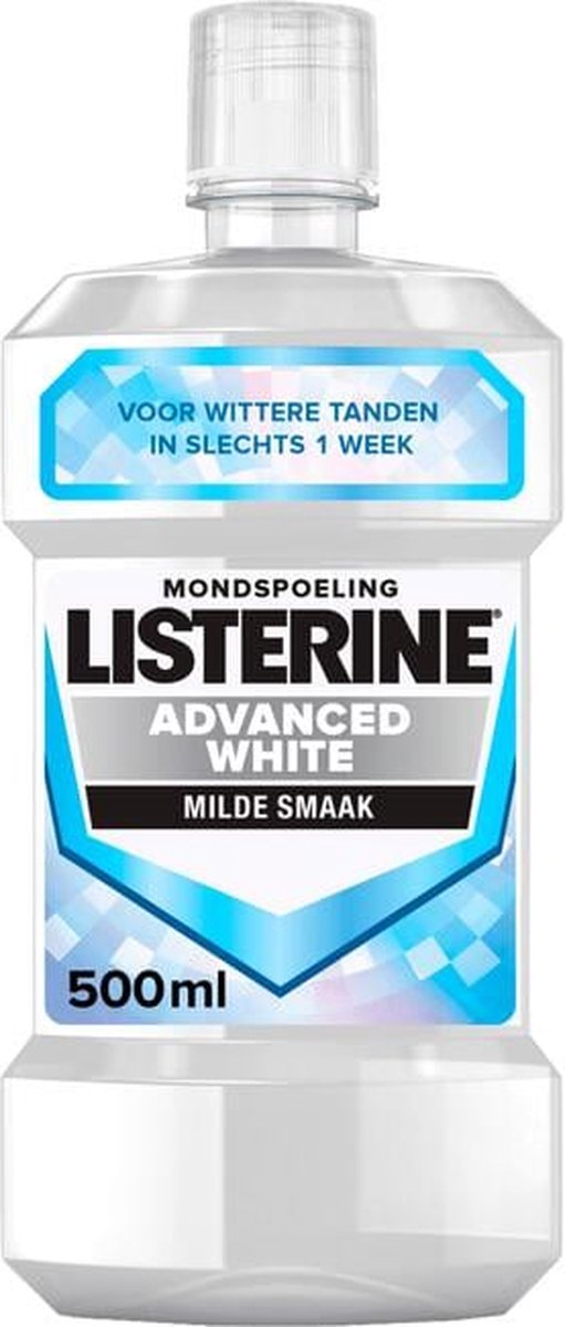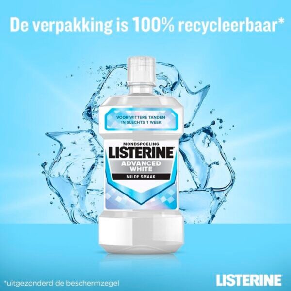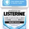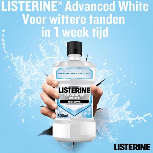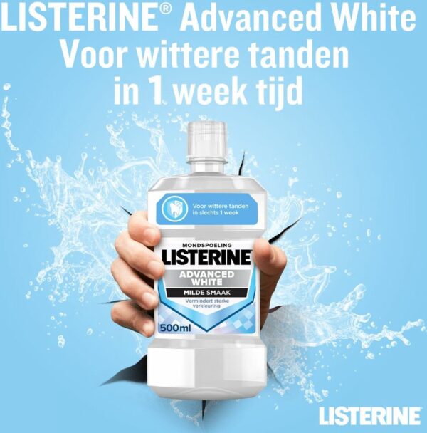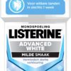 Listerine Mondwater Advanced White Mild werkt verfrissend. Het mondwater bevat essentiële oliën en fluoride, deze combinatie is speciaal samengesteld om de tanden witter te maken en eventuele verkleuringen aan de tanden de voorkomen. Witte tanden en een frisse adem geven een zelfverzekerd gevoel. De verfrissende mondspoeling van Listerine geeft binnen 2 weken zichtbaar resultaat.