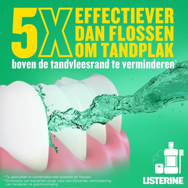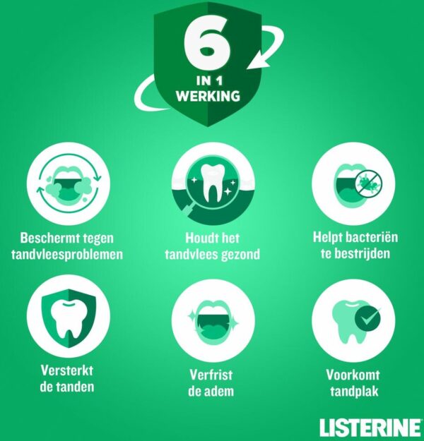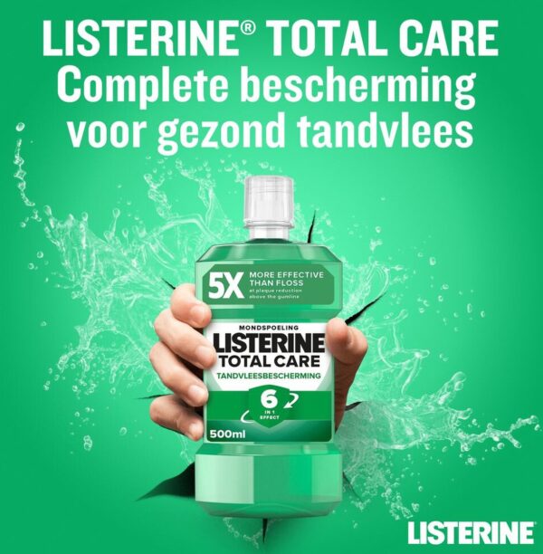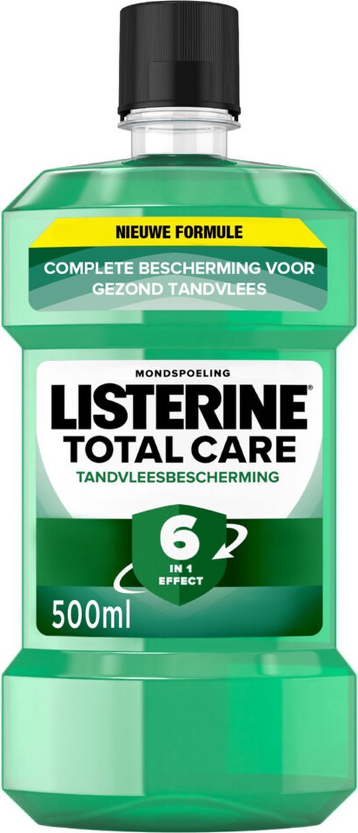 Listerine Mondwater Total Care Tandvleesbescherming is een frisse mondspoeling. Het mondwater helpt tot 99% van de bacteriën te verwijderen op plaatsen waar de tandenborstel niet bij komt. Tand & Tandvlees Bescherming mondspoeling voorkomt tandplak en tandsteen en houdt het tandvlees gezond. Geniet van een frisse adem en optimale mondconditie door ook bacteriën van de tong te verwijderen. Listerine respecteert de natuurlijke mondflora.