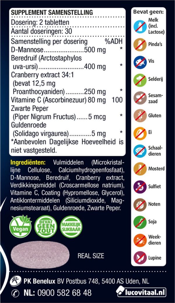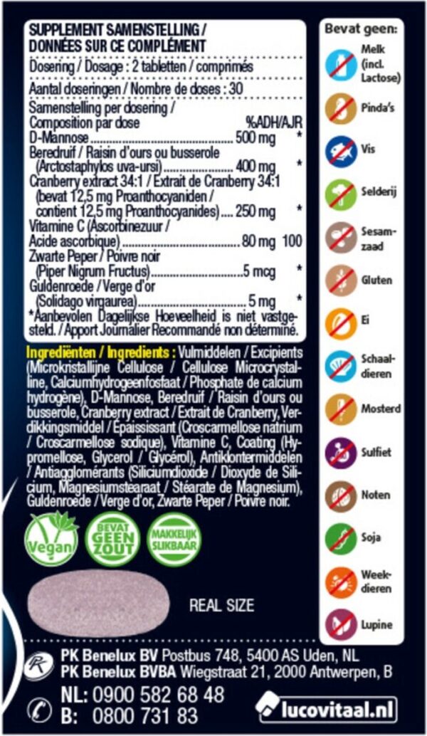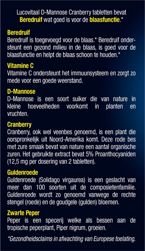D-Mannose Cranberry tabletten van Lucovitaal bevat een combinatie van werkzame stoffen die een gezonde werking van de blaas ondersteunen.