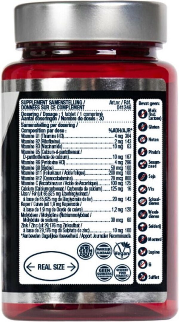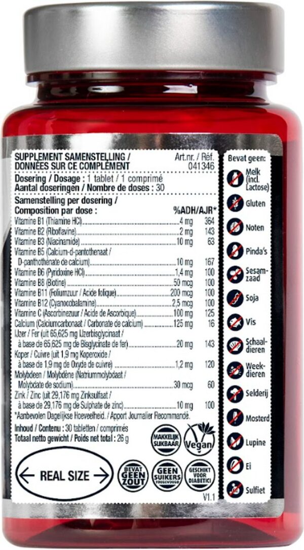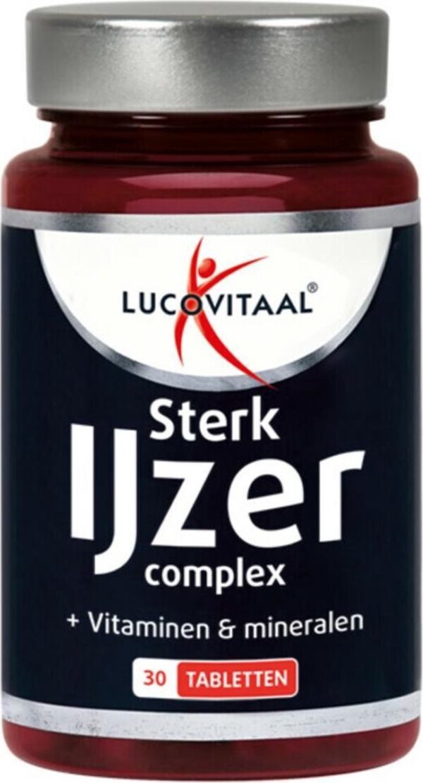 Bevat een extra hoge dosering IJzer. IJzer ondersteunt het energieniveau, draagt bij aan extra energie bij vermoeidheid en ondersteunt het immuunsysteem. brand LUCOVITAAL