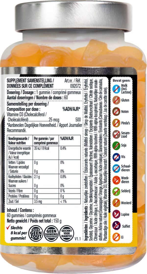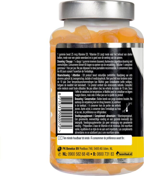 Lucovitaal Gummies Vitamine D3 1 gummie bevat 25 mcg Vitamine D3 Zonder kunstmatige kleur- en smaakstoffen Sinaasappel smaak Suikervrij Lucovitaal Vitamine D3 Gummies bevat 25 mcg Vitamine D3 per gummie. Vitamine D3 zorgt voor het behoud van sterke botten, mede voor een goede weerstand en is goed voor de werking van de spieren. brand LUCOVITAAL
