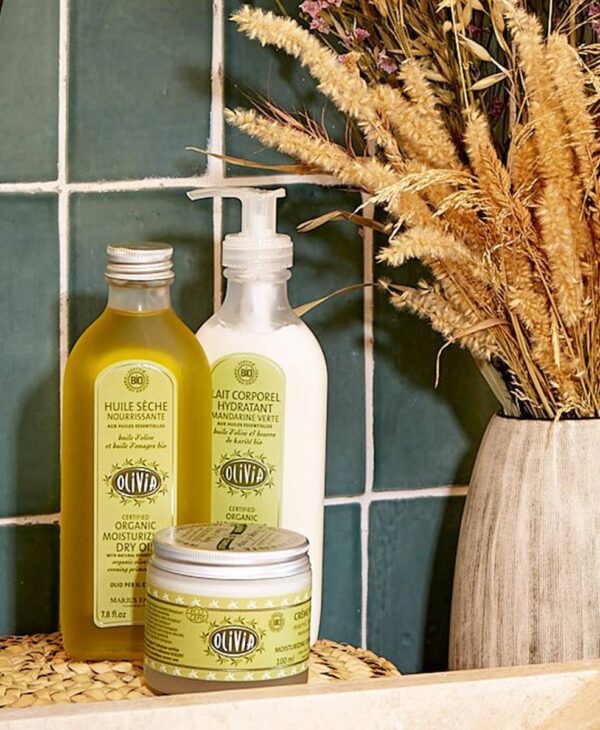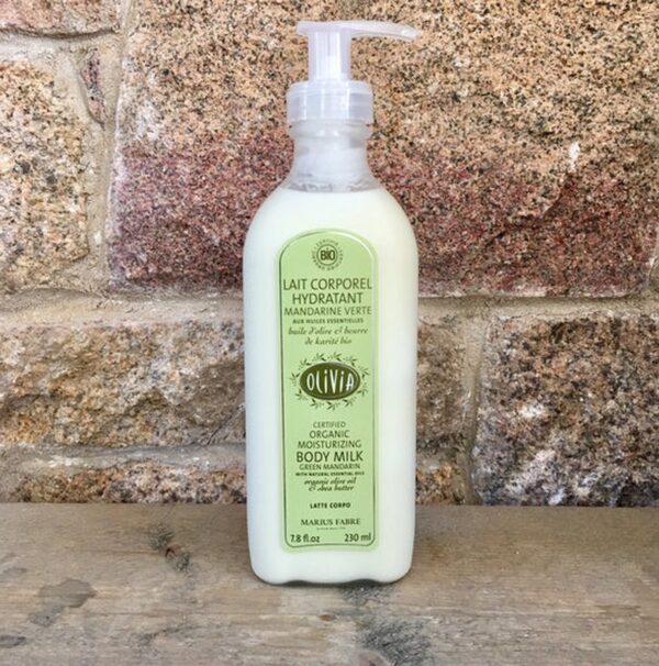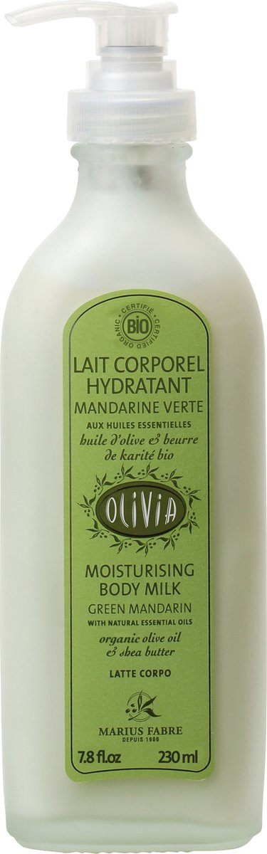De Olivia Bodylotion van Marius Fabre is een hydraterende bodymilk en bevat biologische karitéboter, olijfolie, en essences van groene mandarijn, geranium, citroen en lavendel.