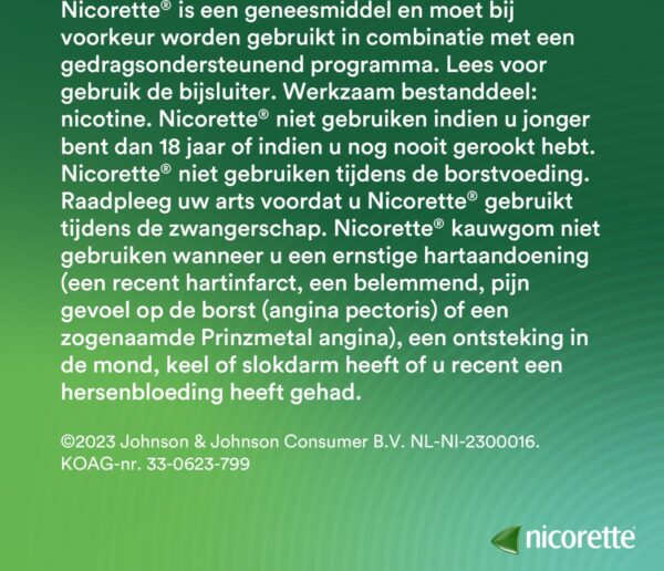 Nicorette® suikervrij Kauwgom is een geneesmiddel voor volwassenen.Gebruik van Nicorette langer dan een jaar achtereen wordt niet aangeraden. Niet te gebruiken door niet-rokers. Niet gebruiken indien u jonger bent dan 18 jaar. Niet gebruiken bij een ernstige hartaandoening (recent hartinfarct, hartritmestoornissen, een beklemmend of pijnlijk gevoel op de borst (angina pectoris), of een zogenaamde Prinzmetal angina), een hersenbloeding (beroerte) of een ontsteking in de mond, keel of slokdarm. Lees voor gebruik de bijsluiter.