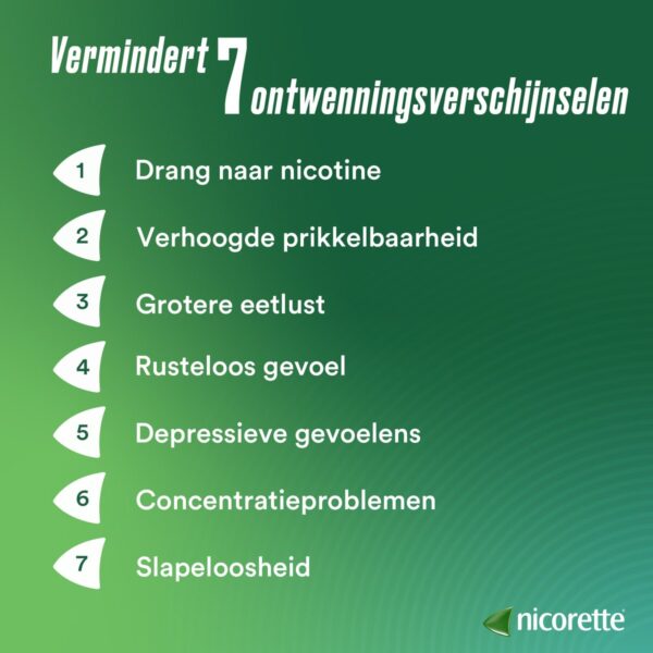 Nicorette® suikervrij Kauwgom is er voor die momenten waarop je je zin om te roken wilt onderdrukken. Nicorette® Kauwgom is een methode om zowel onmiddellijk als geleidelijk aan te stoppen met roken. De nicotine in de kauwgom is voor therapeutisch gebruik en voldoende om je ontwenningsverschijnselen onder controle te helpen houden. Om je rookgewoonte te doorbreken wordt een behandeling van tenminste drie maanden aanbevolen. Je bouwt je behoefte geleidelijk af en kunt stoppen wanneer 1 tot 2 kauwgoms per dag volstaan.