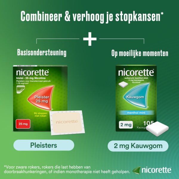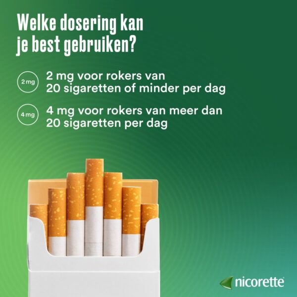 Nicorette® suikervrij Kauwgom met 4 mg nicotine is geschikt voor personen die meer dan 20 sigaretten per dag roken of die hun eerste sigaret binnen 30 minuten na het ontwaken roken. Voor minder afhankelijke rokers wordt de 2 mg kauwgom aangeraden.