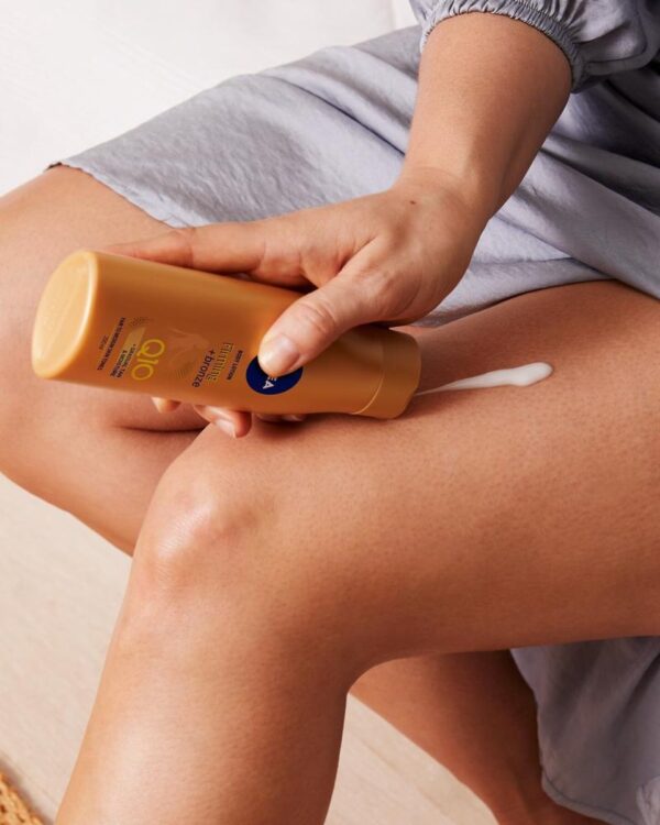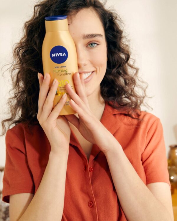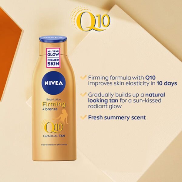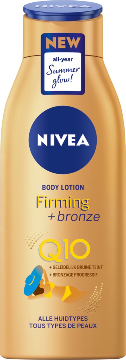 Wil je stralen als de zomerzon met een mooiere huid? Omarm en benadruk je zomerse gloed. NIVEA Q10 Firming + Bronze Body Lotion heeft een verstevigende formule met Q10 die de elasticiteit van de huid in slechts 10 dagen verbetert. De bodymilk bouwt een natuurlijk gebruinde look op en komt bovendien de conditie van je huid ten goede. Laat het hydrateren maar aan deze bodylotion over.