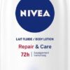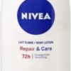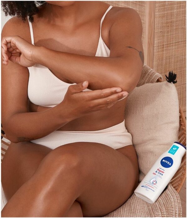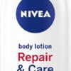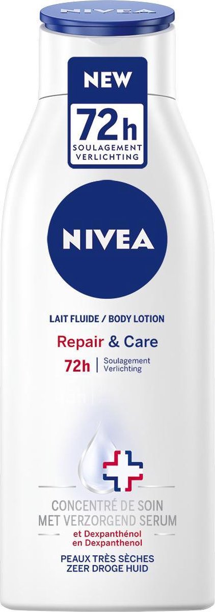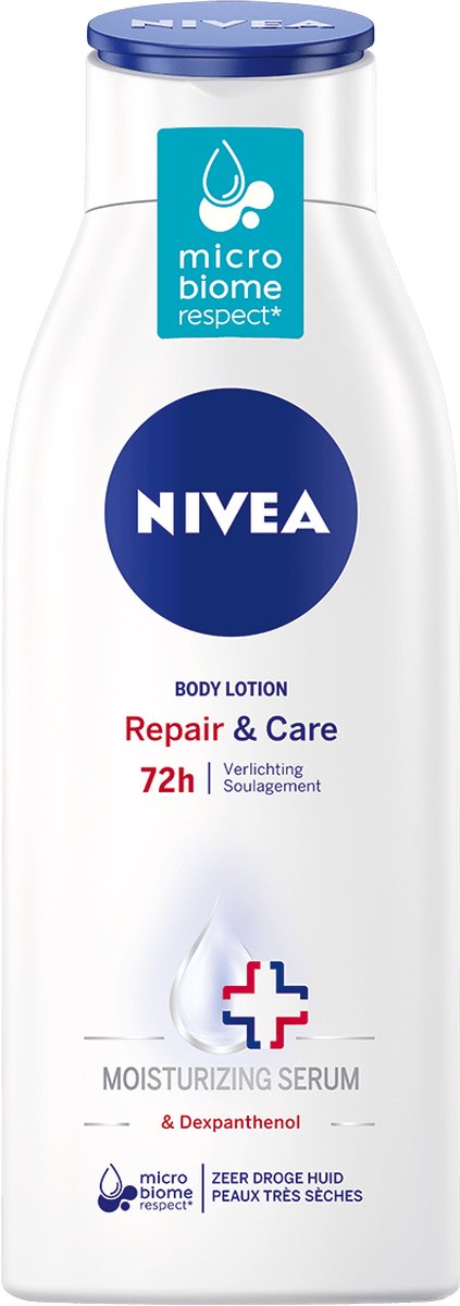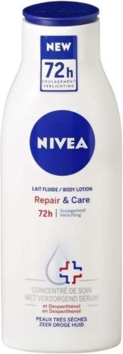 NIVEA’s gepatenteerde formule is verrijkt met VERZORGEND SERUM, een unieke samenstelling van het huideigen hydraterende vermogen, verzorgende lipiden en voedende oliën. NIVEA® Repair & Care Body Lotion is speciaal ontwikkeld in samenwerking met een dermatoloog. De Body Lotion bevat verzachtend Dexpanthenol en versterkt de huidbarrière om vochtverlies van de huid te voorkomen.