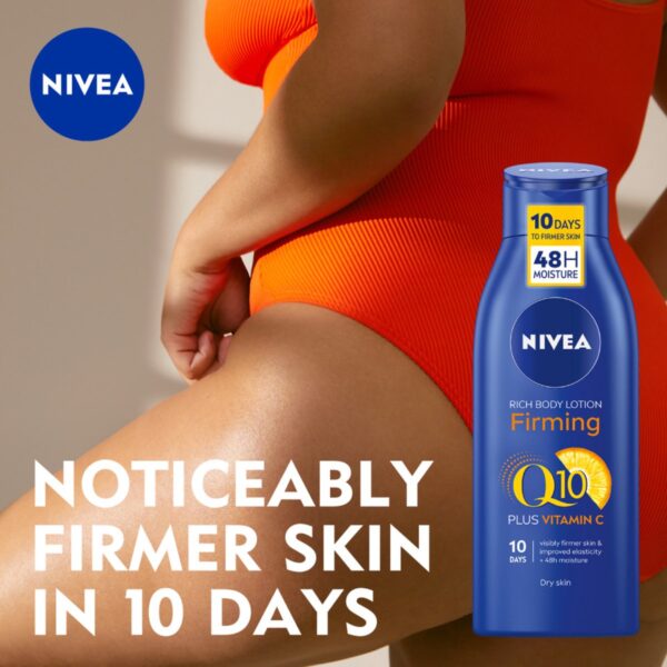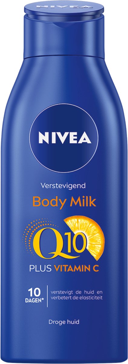 Kan je huid wel een verjongende boost en wat nieuwe energie gebruiken, en zoek je een bodymilk, bodycrème of bodylotion die hieraan bijdraagt? NIVEA Q10 plus Verstevigende Bodymilk is verrijkt met twee krachtige antioxidanten: Q10 en vitamine C. De verbeterde formule verstevigt de droge huid en verbetert de elasticiteit van je huid in tien dagen. De voedende bodymilk, voorzien van glycerine vloeistof, hydrateert je huid intensief gedurende 48 uur. Gun jezelf deze wellness en zie en voel het verschil op je (voorheen) droge huid. De huidverdraagzaamheid van deze NIVEA huidverzorging is vanzelfsprekend dermatologisch goedgekeurd – de ingrediënten voor deze bodymilk zijn geselecteerd volgens strenge kwaliteitsnormen.