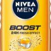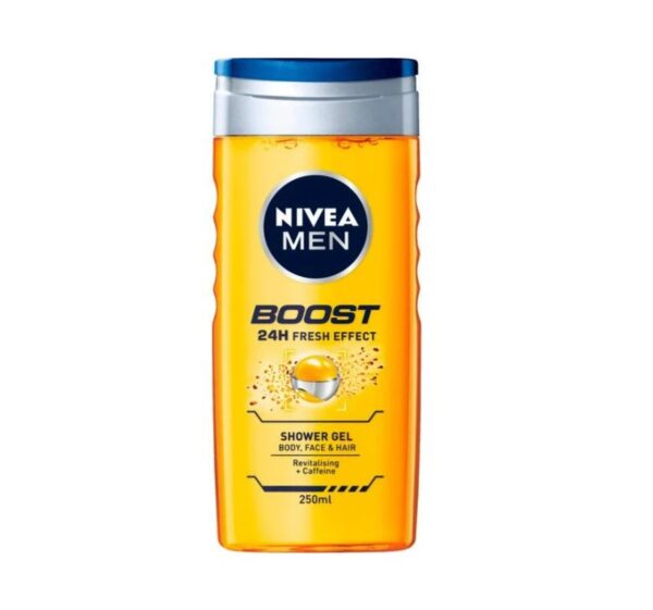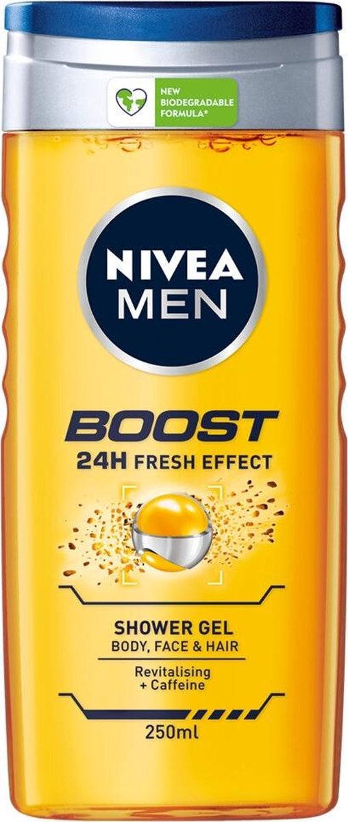 NIVEA MEN BOOST, met cafeïne van natuurlijke oorsprong om je dag een vliegende start te geven. De verfrissende formule met 100% cafeïne van natuurlijke oorsprong is ideaal voor je ochtendroutine. Het laat je huid en haar gerevitaliseerd en verzorgd aanvoelen. Breng de douchegel eenvoudig aan op uw natte huid en masseer het op uw lichaam, gezicht en haar voordat u het afspoelt. De formule is 99% biologisch afbreekbaar.* Word wakker met NIVEA MEN BOOST. *Volgens OESO 301/302 of equivalente methoden
