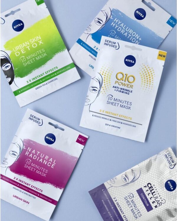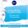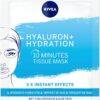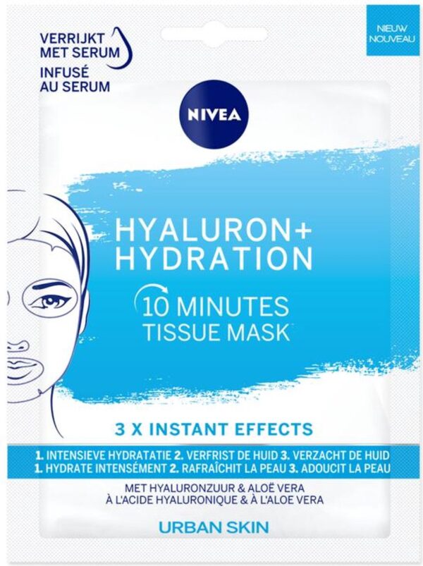 Een perfecte verzorging voor een vochtarme huid. Dagelijkse stress, het milieu en vervuiling kunnen de huid droog aan laten voelen. Neem 10 minuten om te ontspannen en laat het NIVEA 10 Minute Tissue Mask je huid voorzien van een zorgzame dosis vocht. Het tissue masker is verrijkt met een halve fles serum *, hyaluronzuur en Alo Vera voor de huid die vol aanvoelt, wordt aangevuld met vocht en intensief wordt verzorgd.