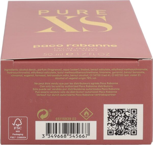 Paco Rabanne Pure XS For Her is een ongetemde geur, waarin de zoete bloemige geur van ylang-ylang tot een hoogtepunt komt. Een explosie die de zintuigen op scherp zet. Verleidelijk met een speelse twist van popcorn. Verder gebruikte parfumeur Quentin Bisch vanille, muskus ambrette, kokosnoot, oranjebloesem, muskus, perzik, amberhout en sandalhout.