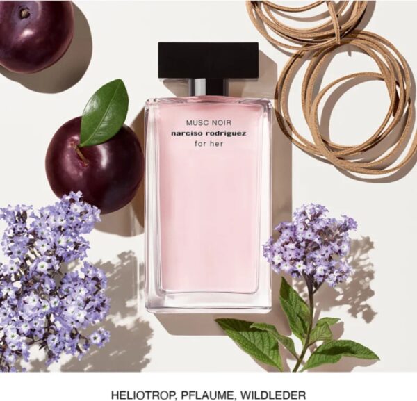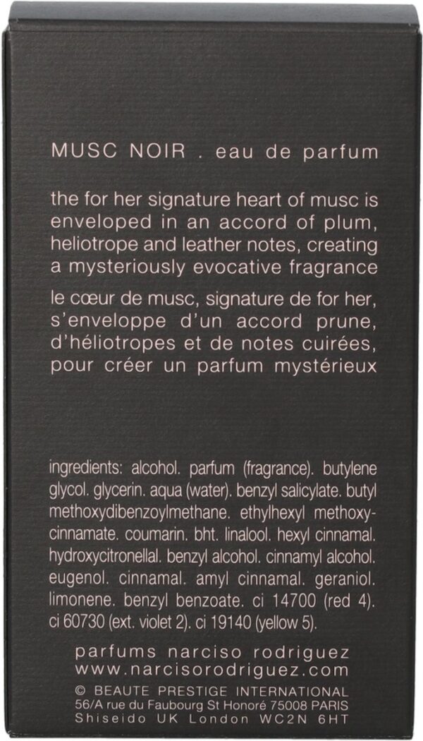 In het Narciso Rodriguez Musc Noir parfum wordt de Narciso For Her-signatuur met een hart van muskus gehuld in mysterie en sensualiteit. Topnoten die het parfum lichter maken zijn sappige pruim en verslavende heliotroop. Het betoverende van muskus geeft textuur aan een donkere en sensuele suède toets. Het ondoorgrondelijke parfum is een eerbetoon aan de dubbelzinnigheid die elke vrouw in zich draagt. Een clair-obscur waarin schaduw en licht naar elkaar op zoek gaan in een mix van mysterie en sensualiteit. De combinatie van mysterie en kracht en licht en contrast maakt Musc Noir de aanvulling op de For Her lijn van Narciso Rodriguez.