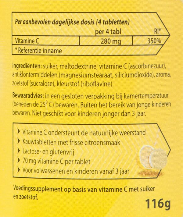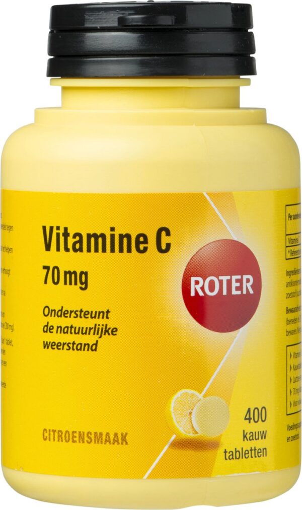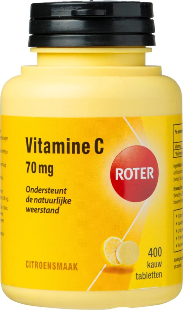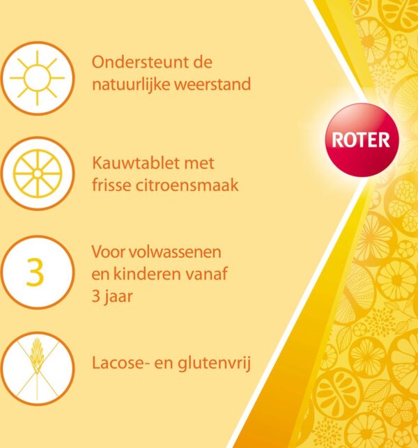 Roter Vitamine C 70mg Kauwtabletten ondersteunen de natuurlijke weerstand en je immuunsysteem. Lekkere kauwtabletten met frisse citroensmaak als aanvulling op je voeding. De kauwtabletten zijn lactose- en glutenvrij.