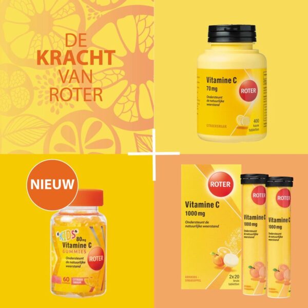 Vitamine C kan je lichaam niet zelf aanmaken. Je moet deze vitamine via voeding binnenkrijgen. Vitamine C zit in groenten, fruit en aardappelen. Eet je volgens de Schijf van Vijf, dus twee porties vers fruit en minimaal 250 gram groenten per dag, dan krijg je in principe voldoende vitamine C binnen. Vitamine C ondersteunt je natuurlijke weerstand en is nodig voor de vorming van bindweefsel en de opname van ijzer. Roter biedt supplementen met vitamine C als bruistabletten en handige kauwtabletten, dus niets houdt je tegen om je weerstand op peil te houden! Vitamine C is een antioxidant, die de weerstand ondersteunt. Het draagt bij aan de bescherming van gezonde cellen en weefsels tegen vrije radicalen. Vitamine C is ook van belang voor het zenuwstelsel en kan het helpen vermoeidheid te verminderen. Inname van vitamine C bevordert de energiestofwisseling en verhoogt het ijzergehalte in het bloed. Vitamine C heeft een positief effect op de weerstand tijdens en na lichamelijke inspanning.