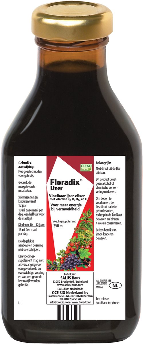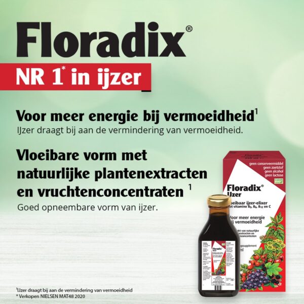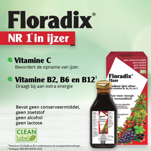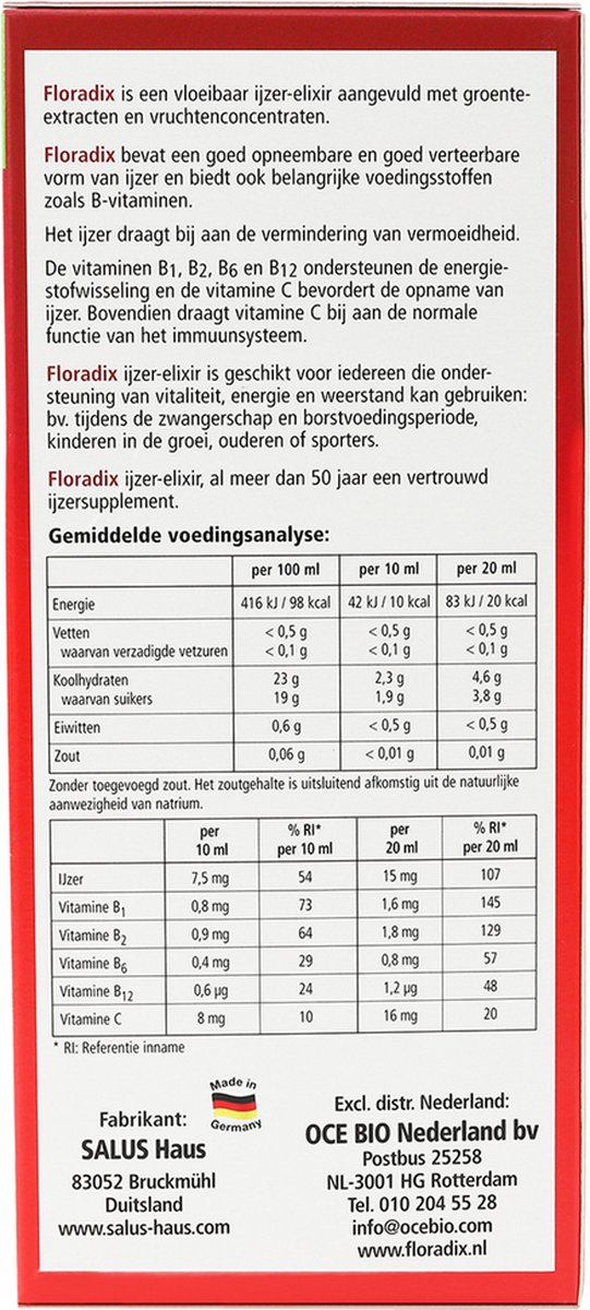 Last van vermoeidheid? Het Floradix IJzer-elixir bevat een goed opneembare en goed verteerbare vorm van ijzer dat bijdraagt aan de vermindering van vermoeidheid. Het biedt belangrijke voedingsstoffen, zoals B-vitaminen (waaronder vitamine B12) en plantenextracten. Het ijzer-elixer in komt in vloeibare vorm en is een vegetarisch voedingssupplement.