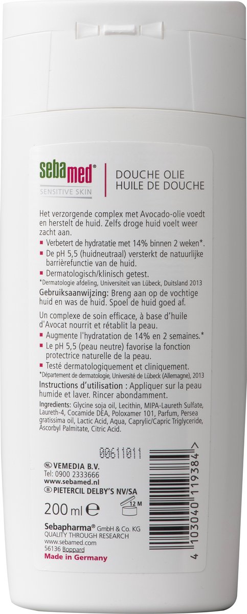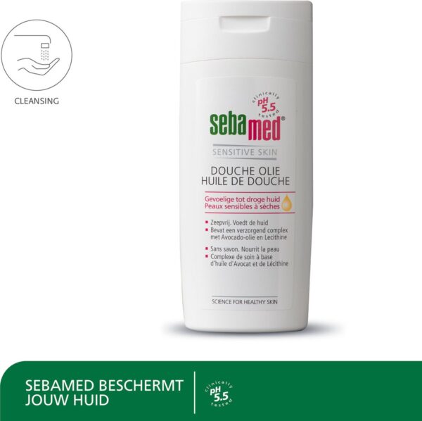 Sebamed Douche Olie geeft niet alleen een gevoel van luxe, het is ook nog eens heerlijk voor je huid. De Douche Olie van Sebamed is 100% zeepvrij en reinigt de gevoelige, droge huid op zachte wijze en brengt de vochtbalans in evenwicht. Sebamed Douche Olie bevat effectieve, hydraterende bestanddelen van avocado-olie en Lecithine. Avocado-olie is rijk aan vitamine A en E., het voedt en herstelt de huid: zelfs droge huid voelt weer zacht aan! Natuurlijke Lecithine voedt de huid tijdens het douchen en brengt de vochtbalans in evenwicht. De huidneutrale pH-waarde van 5,5 versterkt de natuurlijke beschermingslaag van de huid. Zo blijft de huid gezond en in topconditie. Ontwikkelt door en met dermatologen. Dermatologisch/klinisch getest.